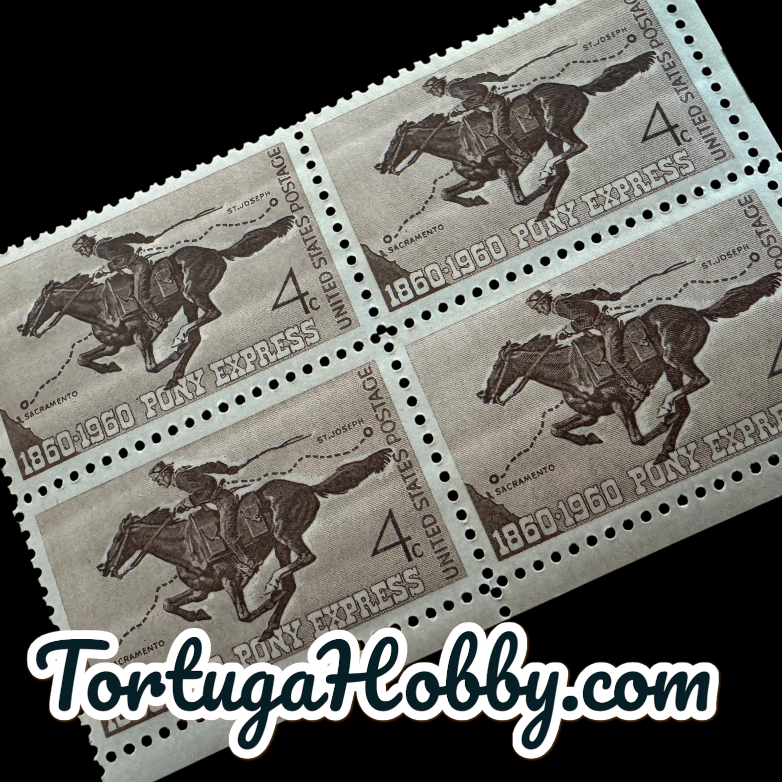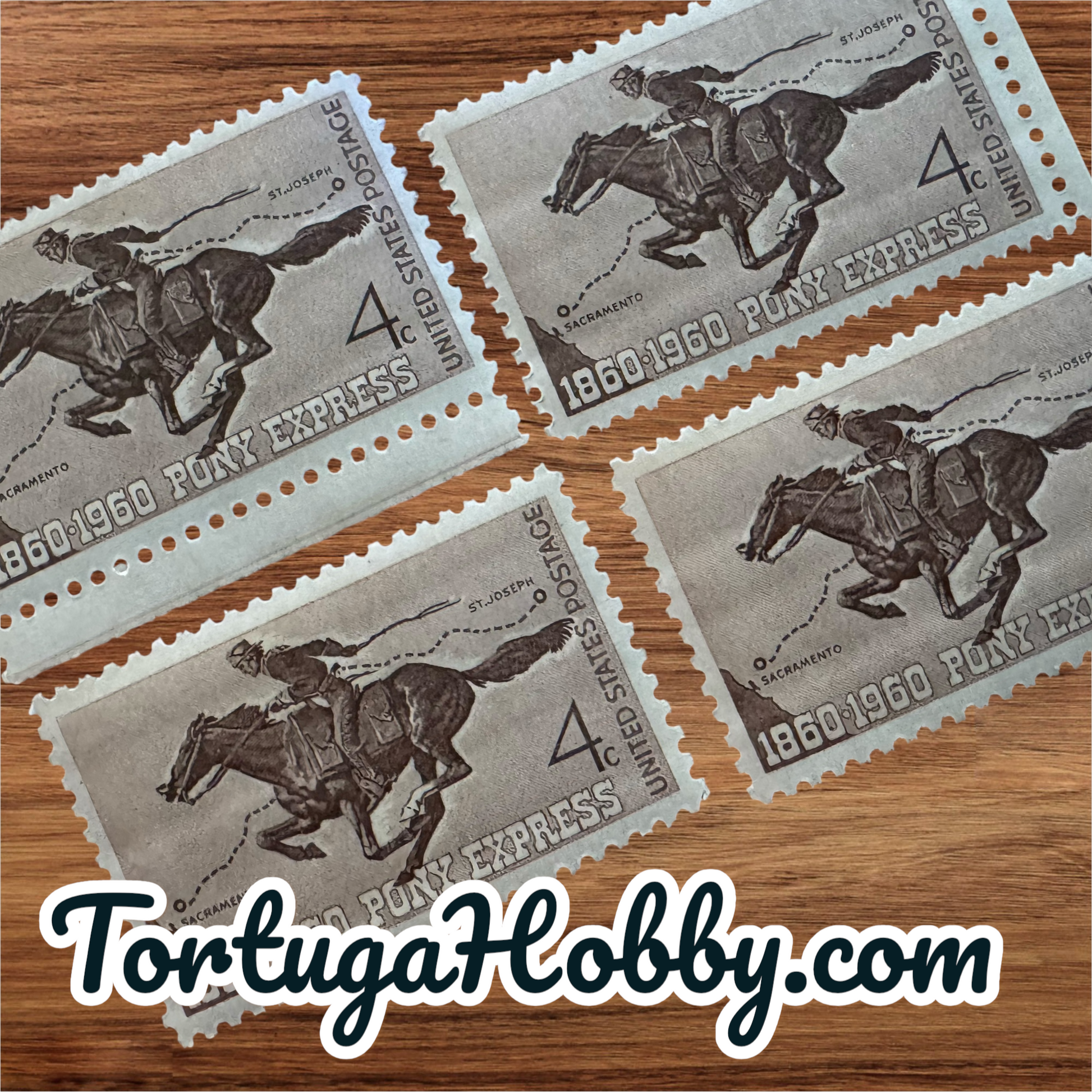 Four unused vintage 4¢ Pony Express postage stamps from 1960, commemorating the 100th anniversary of the Pony Express. Scott #1154