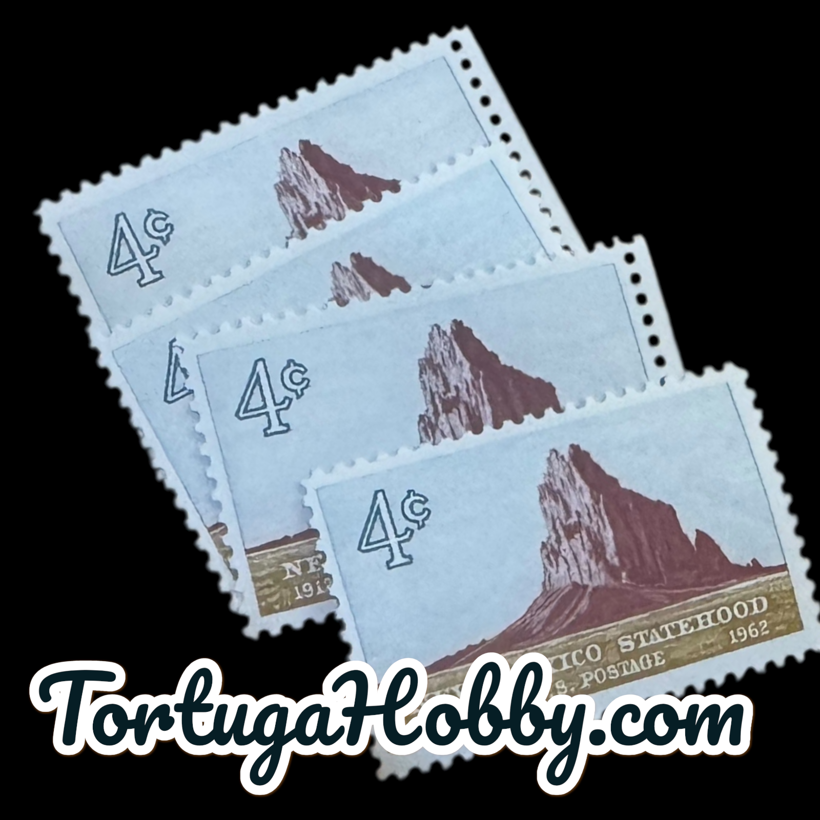 4-cent U.S. postage stamp commemorating the 50th anniversary of New Mexico statehood. The stamp, issued on January 6, 1962, features an image of Shiprock, a prominent mesa in northwestern New Mexico. Includes 4 stamps.