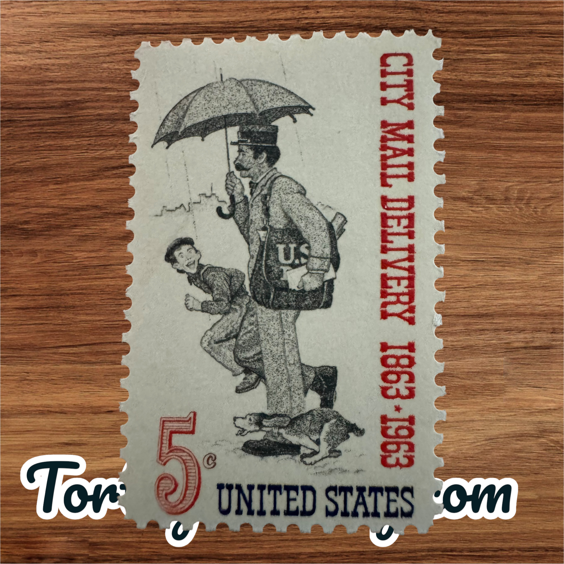 Design:The stamp features a nostalgic drawing by Norman Rockwell depicting an 1860s letter carrier delivering mail in the rain, holding an umbrella, with a young boy and dog following him.