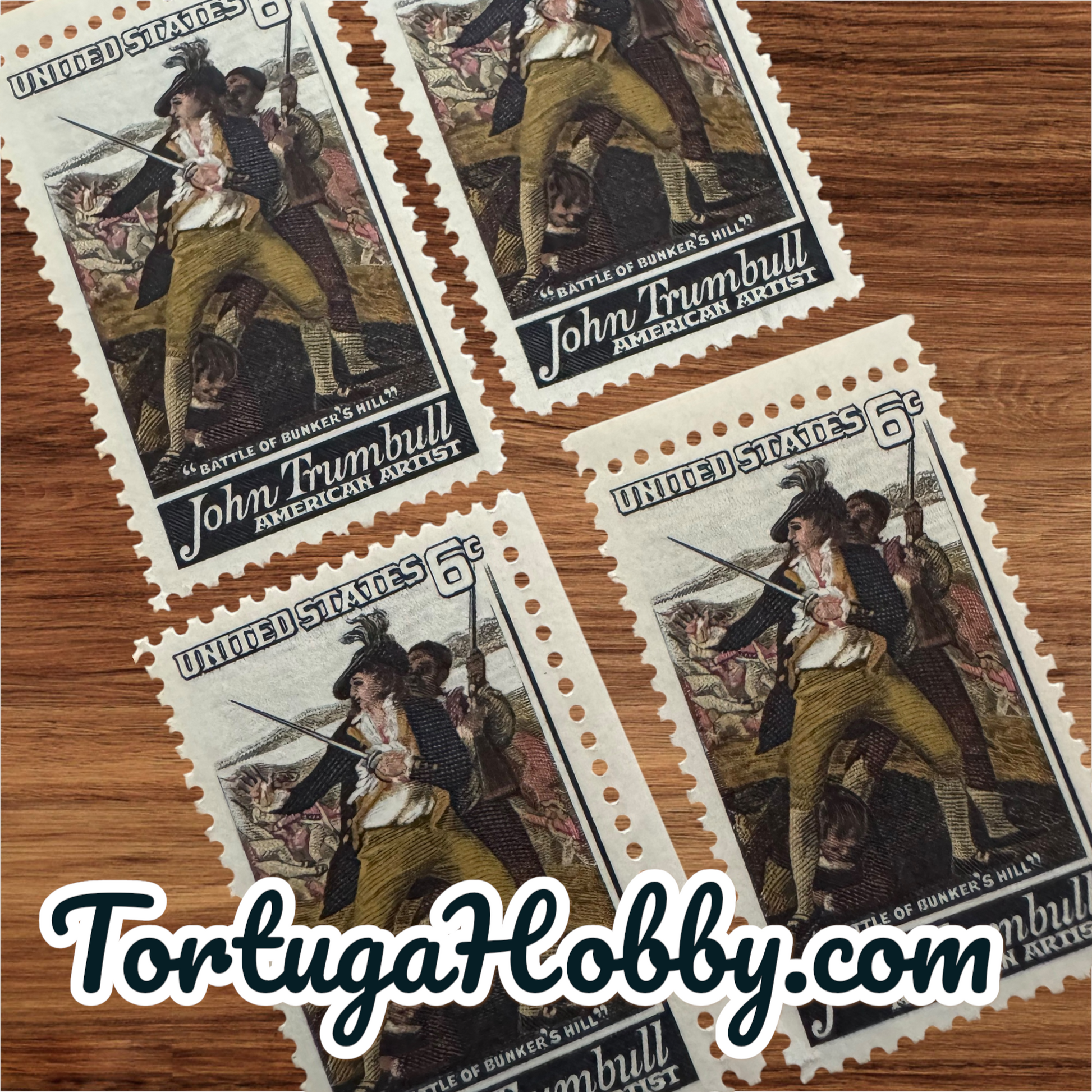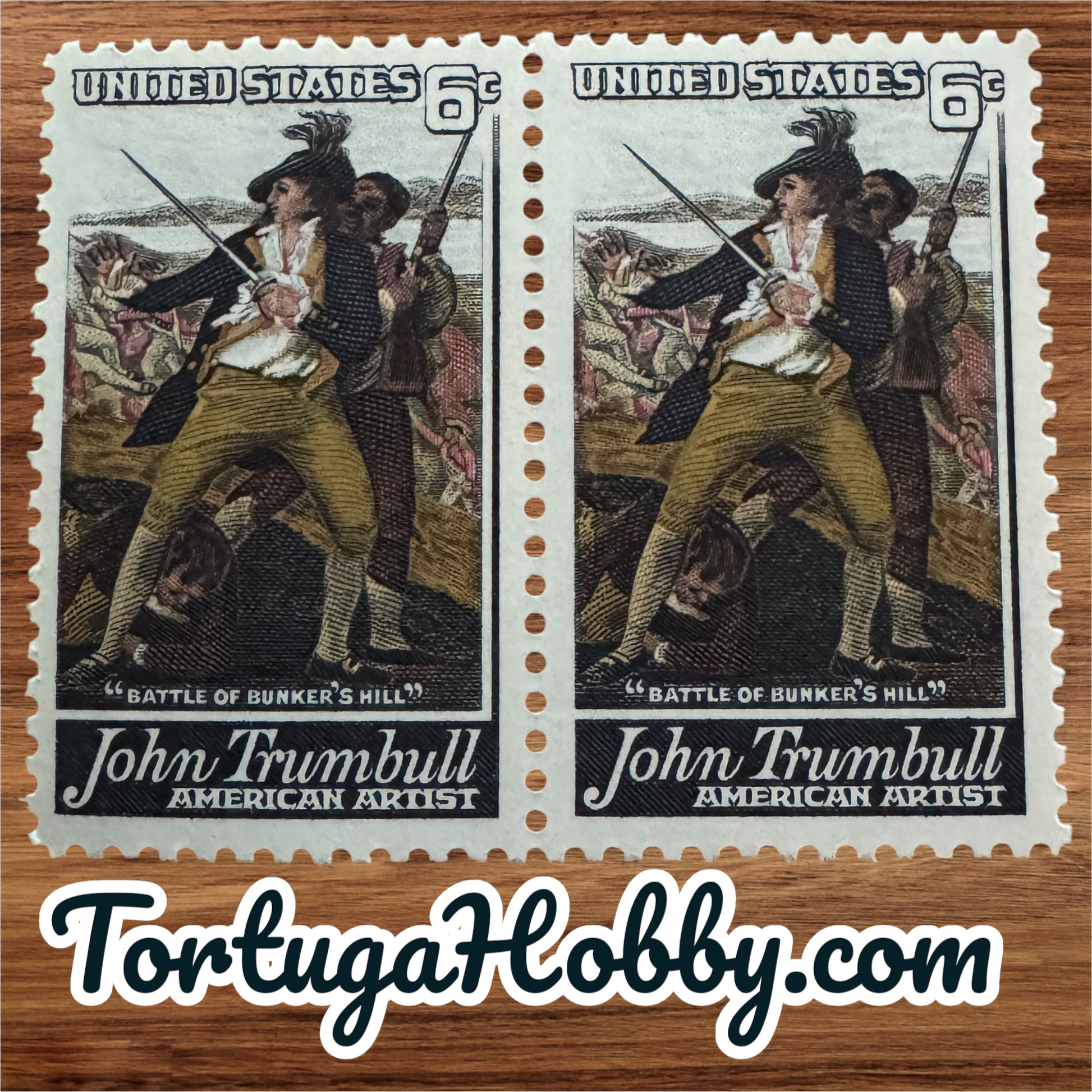 1968 6-cent United States postage stamp featuring the painting "The Battle of Bunker Hill" by John Trumbull. This stamp is Scott catalog #1361 and is part of the American Painting Series. Key details about the stamp: Subject: "The Battle of Bunker Hill," painted by John Trumbull. Denomination: 6 cents. Year of Issue: 1968. First Sale Location: New Haven, Connecticut. Printing Method: Lithographed and engraved. Quantity Issued: 128,295,000. About John Trumbull: John Trumbull was an American artist and patriot who served as an aide to General George Washington during the Revolutionary War. He is known for his historical paintings, including the Battle of Bunker Hill. He also painted portraits of Washington and other significant figures.