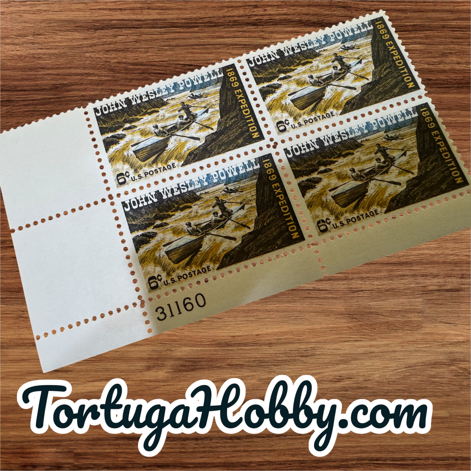 4 stamp block, 6-cent U.S. postage stamps issued in 1969, honoring John Wesley Powell and the 1869 expedition down the Colorado River.
