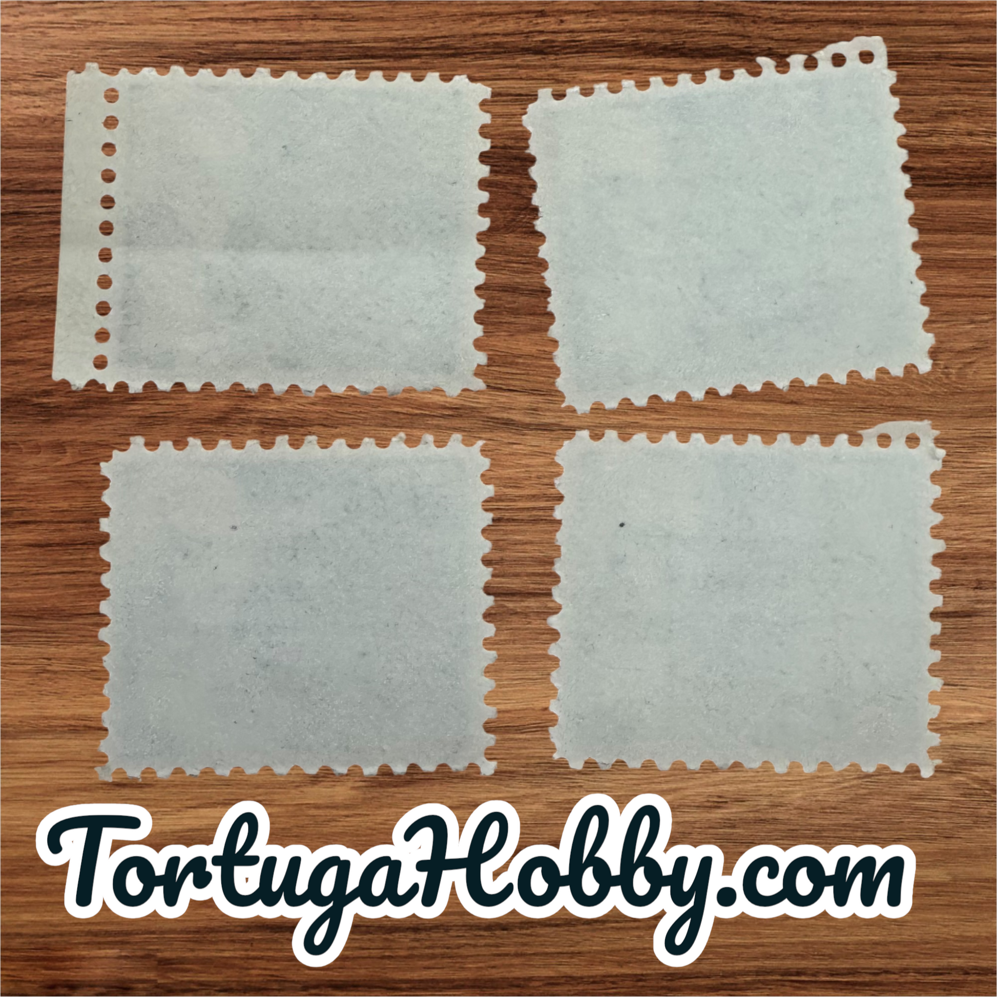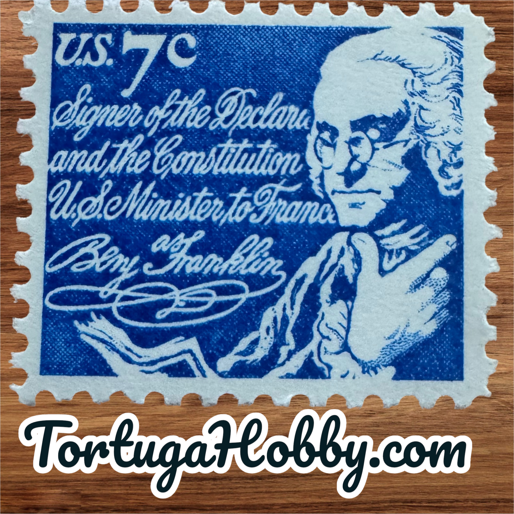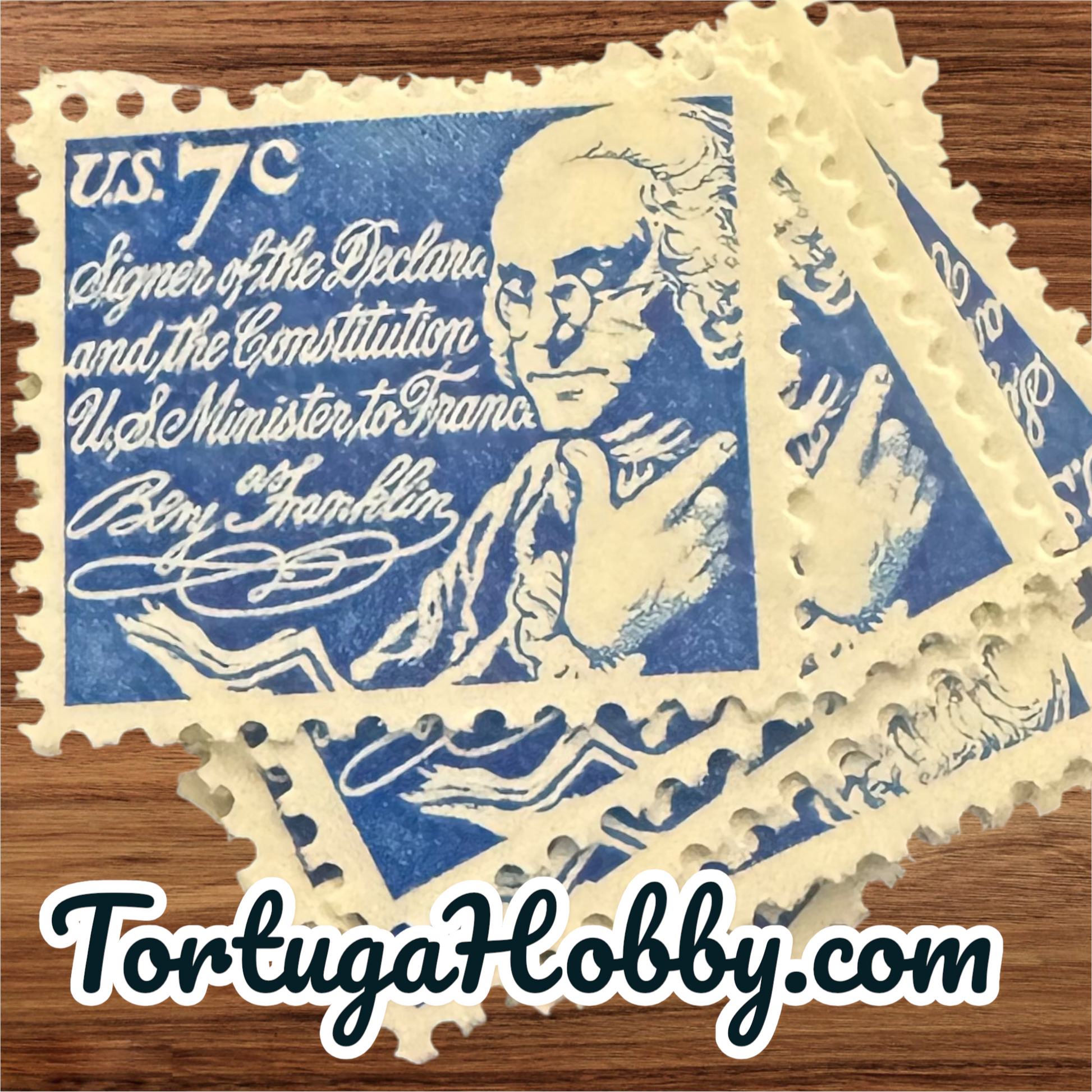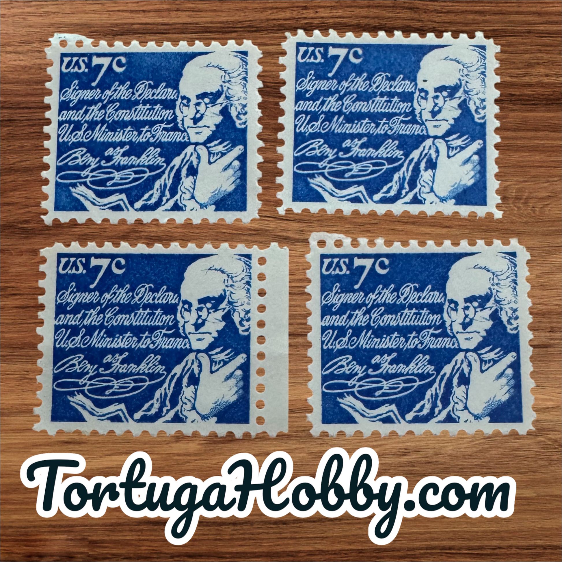 Four 7-cent U.S. postage stamps featuring Benjamin Franklin. These stamps are part of the Prominent Americans Issue, and this specific 7-cent bright blue Franklin stamp was first issued in Philadelphia, Pennsylvania, on October 20, 1972.