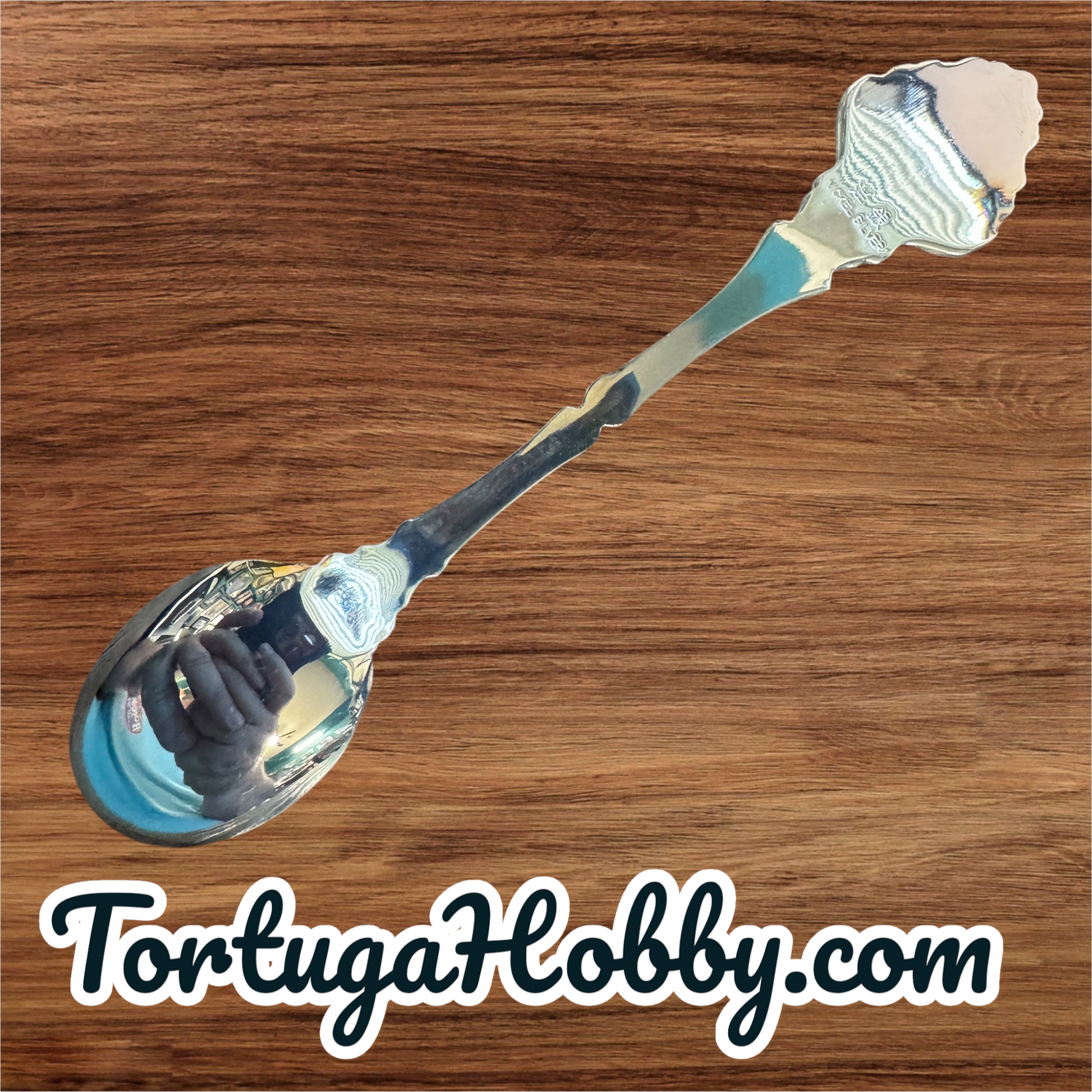 The vintage souvenir spoon features a stunning orchid design in silver cloisonné, handmade in Japan during the 1980s. Includes a spoon made of nickel silver, showcasing intricate craftsmanship and originality. Perfect for collectors of unique flatware pieces, this spoon is a charming addition to any adult's kitchen or home decor. Spoon is 4 5/8" long. |