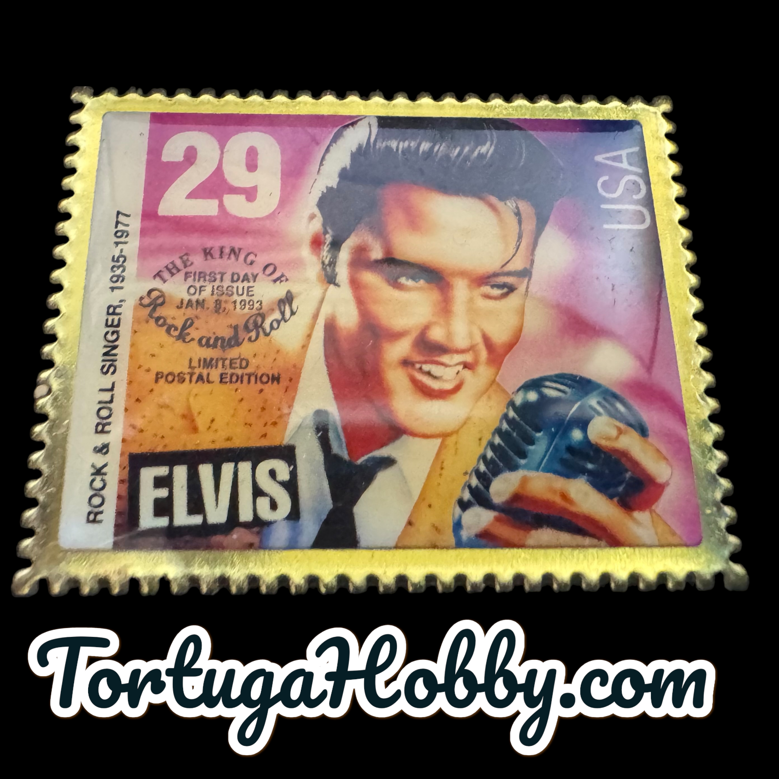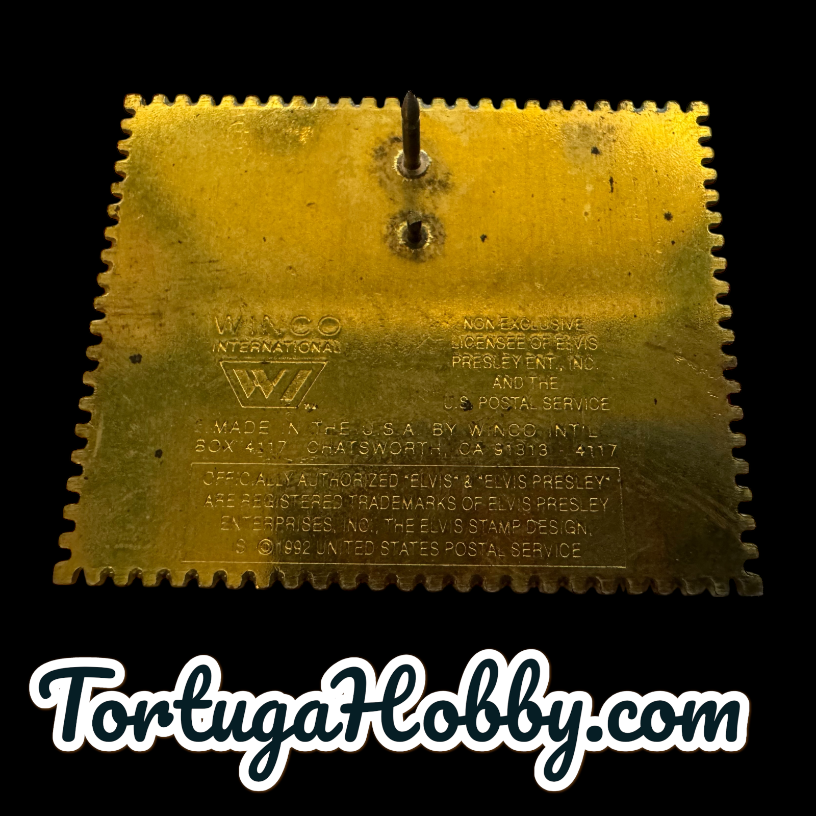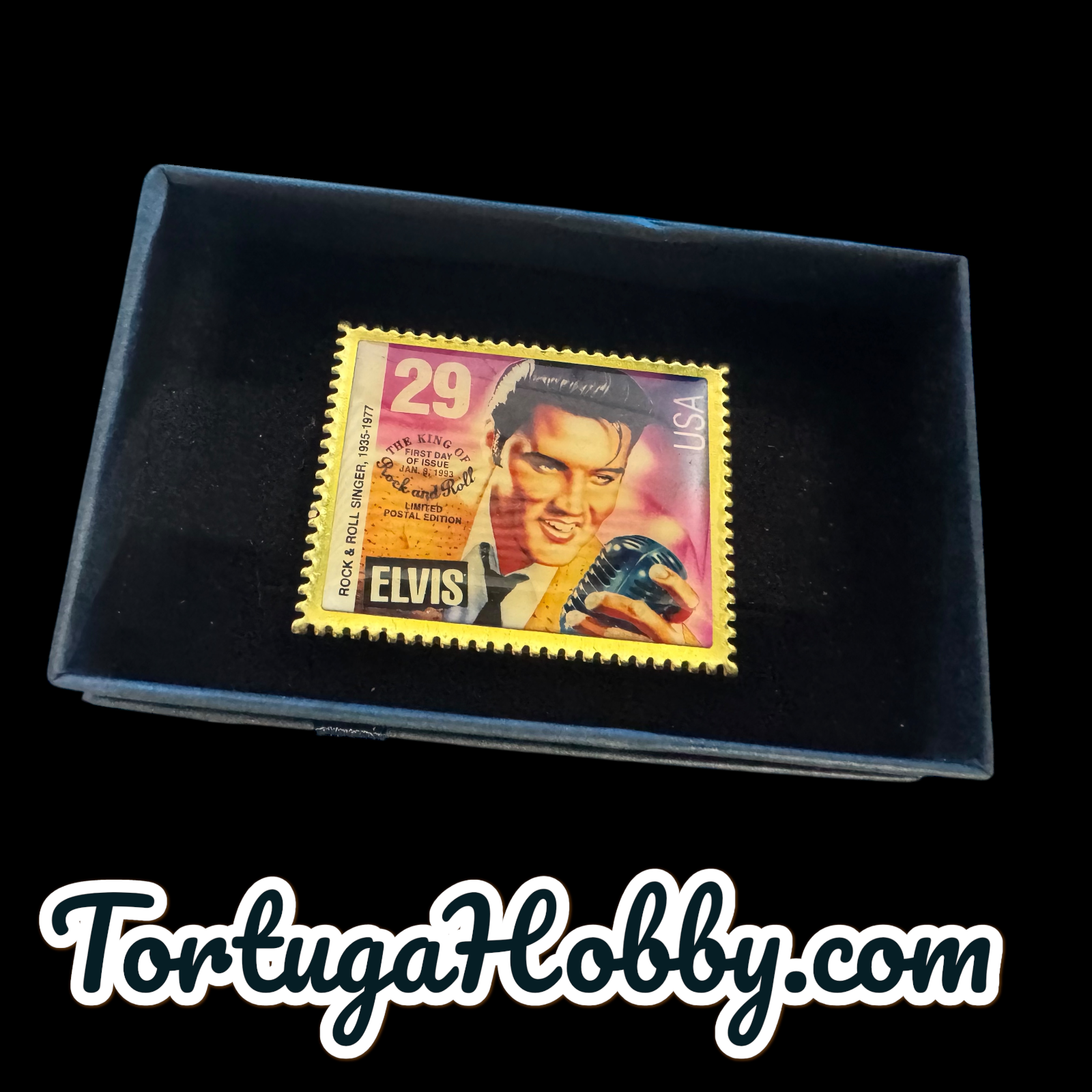 The product is a 1992 Elvis Presley postage stamp lapel pin, manufactured in the United States. This souvenir gift features an iconic image of Elvis Presley on a postage stamp, making it a unique and nostalgic collectible for fans of the legendary musician. Perfect for pinning on lapels, bags, or any other accessories, this lapel pin is a small but meaningful piece of memorabilia celebrating the legacy of Elvis Presley. |
