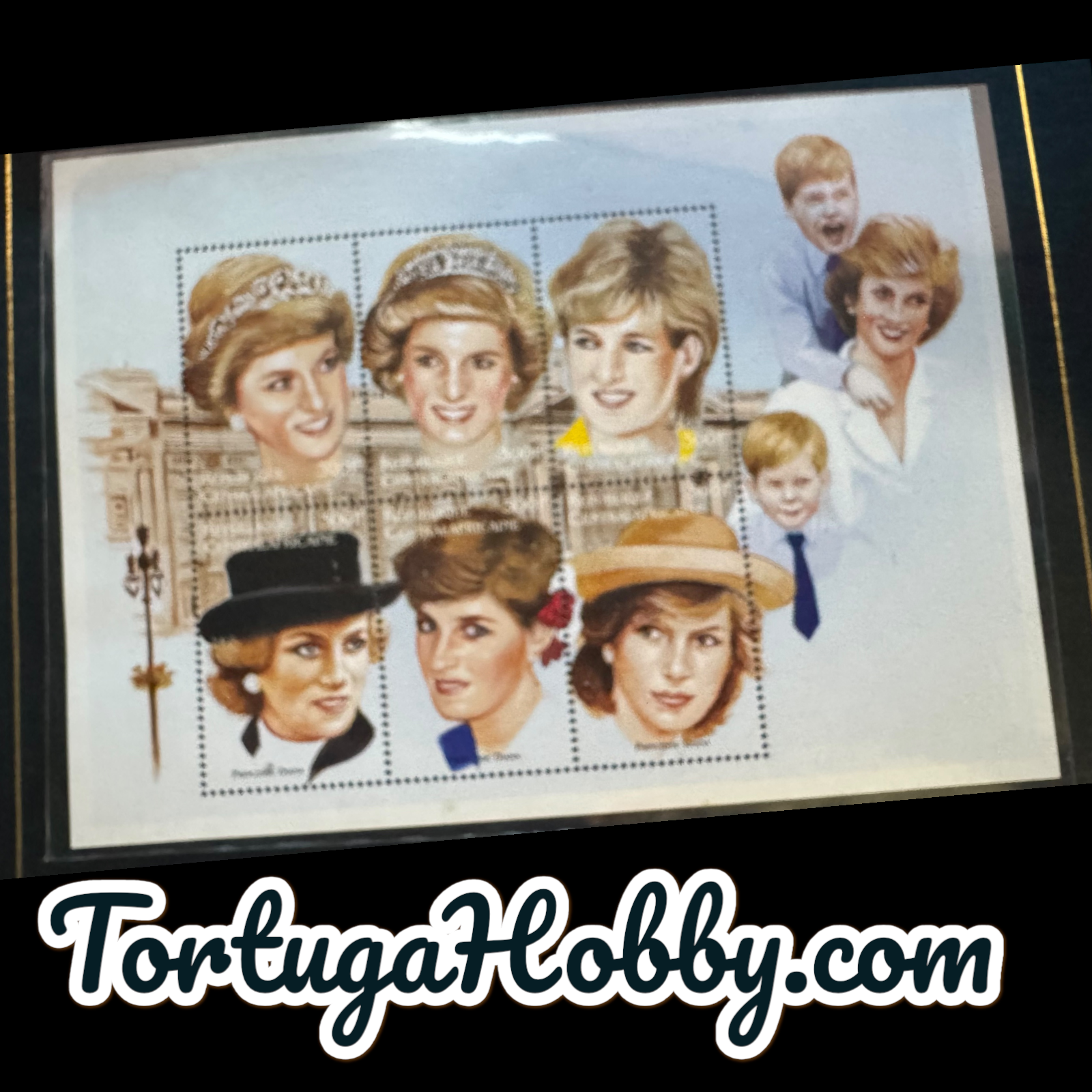 | The product is a souvenir sheet featuring portraits of Princess Diana, issued in 1997 in Central African Republic. This stamp collection, with a denomination of 1500F, showcases royalty as its main theme. With a vibrant multi-color design and mint never hinged quality, this stamp is a collectible item for enthusiasts of royalty-themed philately, originating from Africa and certified by the post office. |