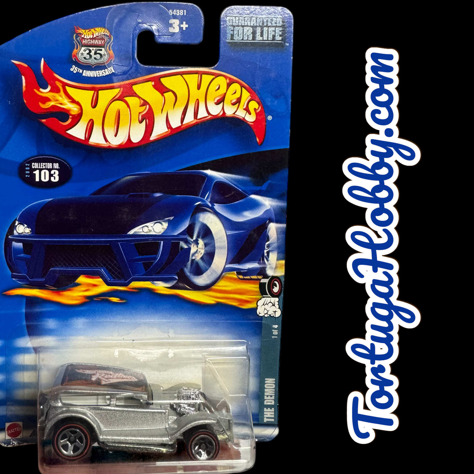 2002 Hot Wheels Red Lines Series The Demon in silver, part of the 35th Anniversary "Highway 35" collection. It is Collector Number 103 out of the entire 2002 mainline assortment and is noted as being 1 of 4 in the special Red Lines sub-series.