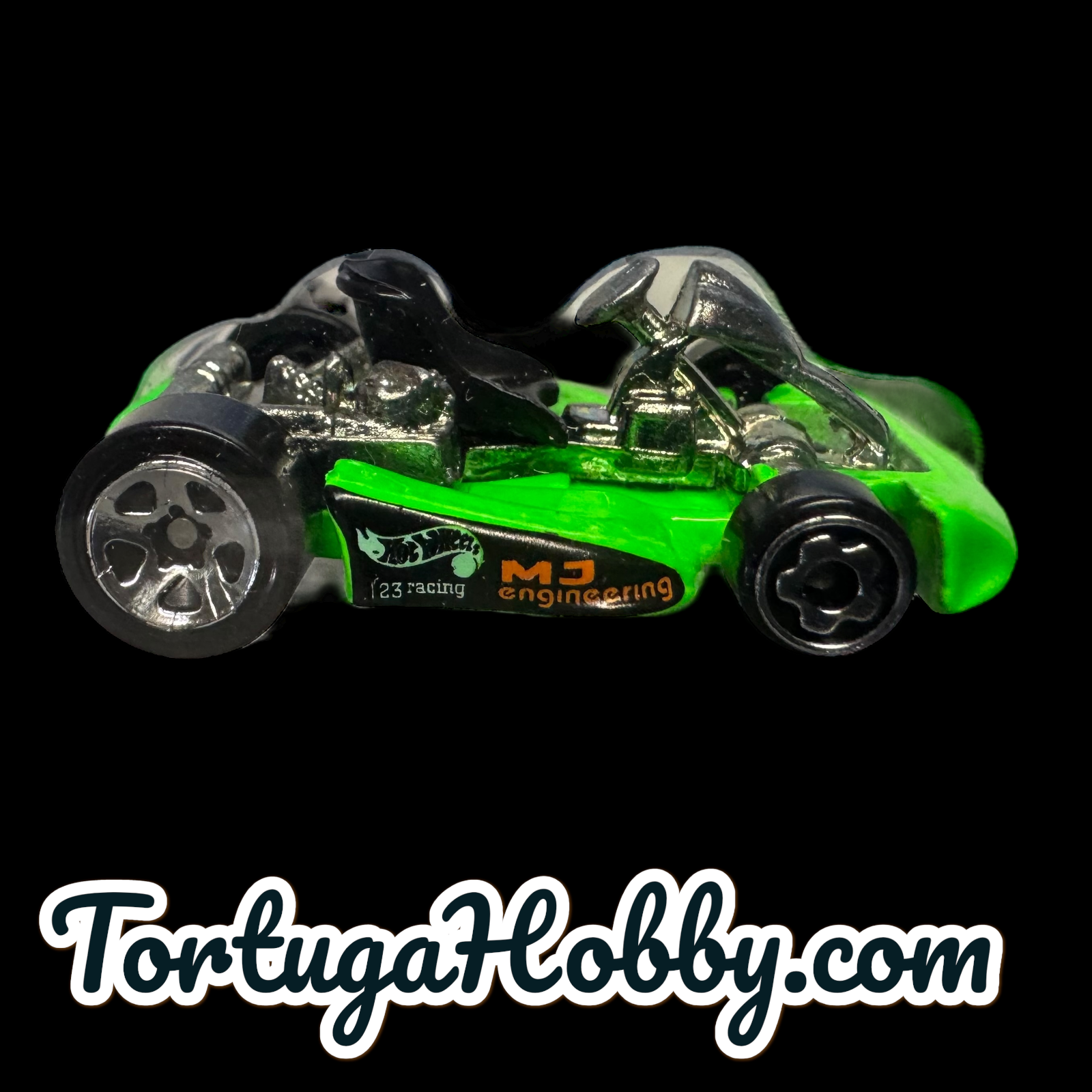 - This particular model features a neon green color scheme with "123 racing" and "MJ engineering" decals.