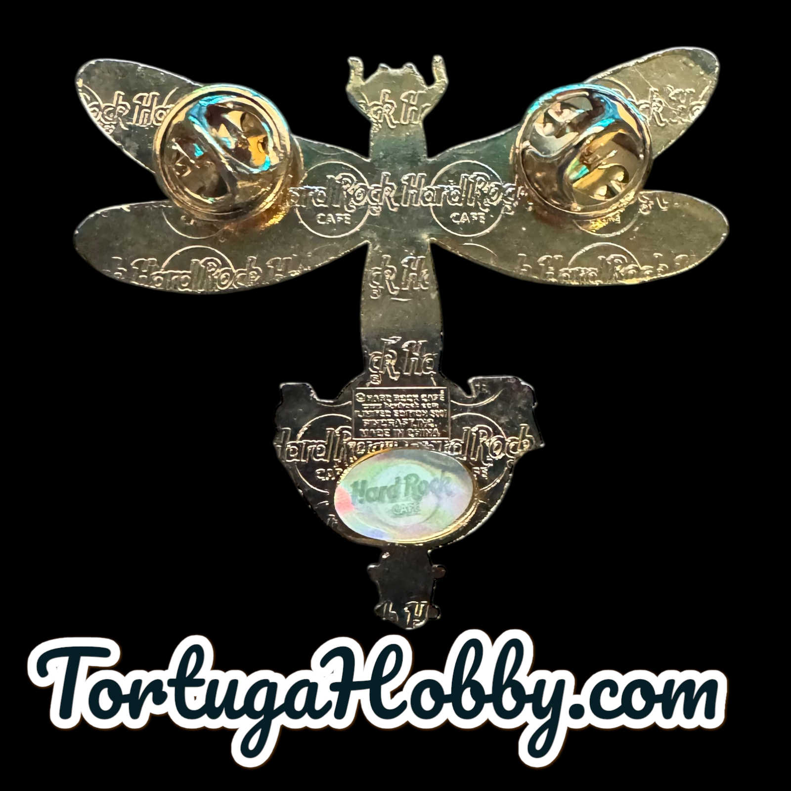 This is a Hard Rock Cafe Louisville Dragonfly Guitar Series pin, which was created in 2004. The Hard Rock Cafe in Louisville closed permanently in 2020 after 16 years in operation due to their lease expiring. The Hard Rock Cafe brand was established in London in 1971. The pin features a dragonfly design with a guitar body and is part of a series of pins with this design from various Hard Rock Cafe locations.