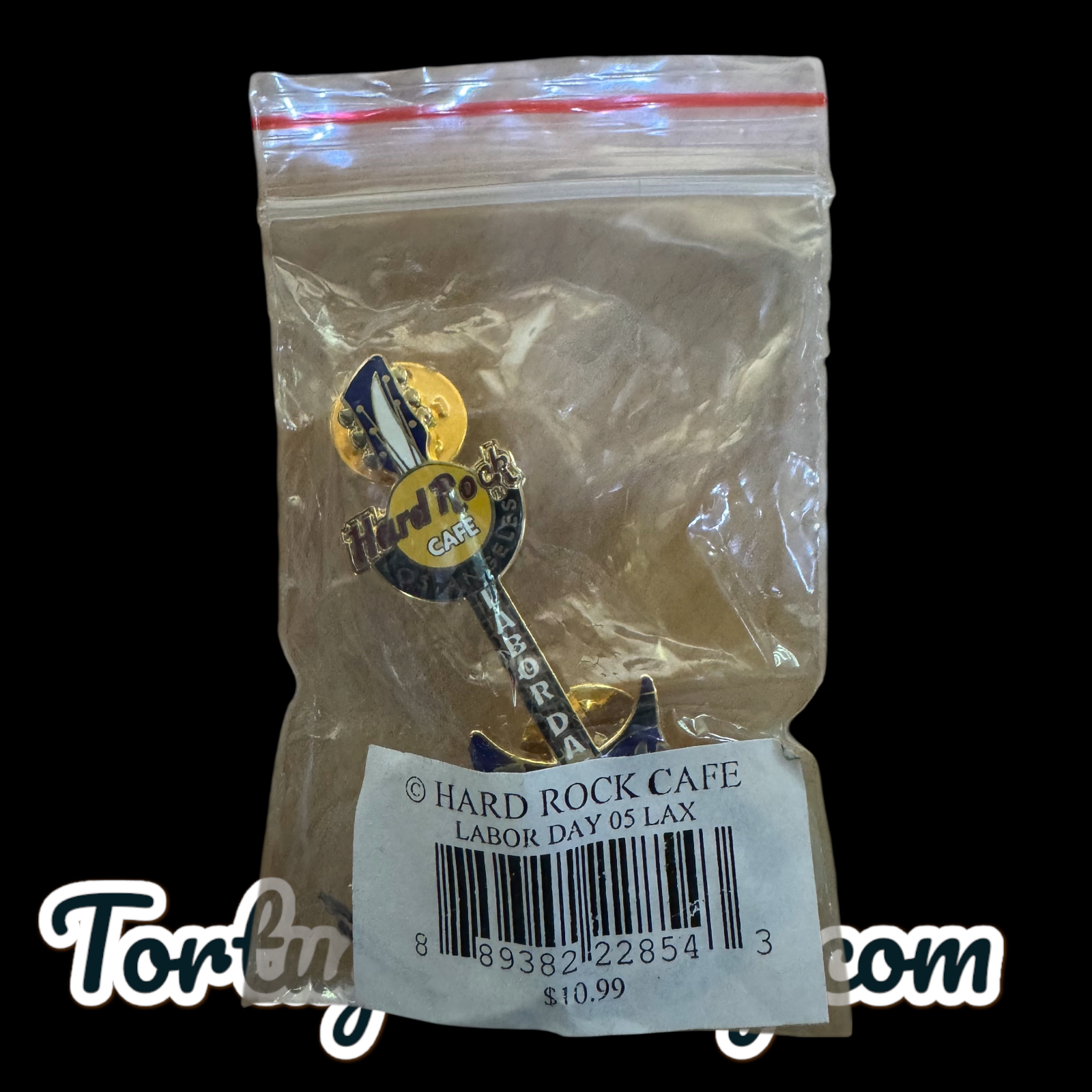 Hard Rock Cafe Los Angeles Labor Day 2005 pin, designed in the shape of a guitar.