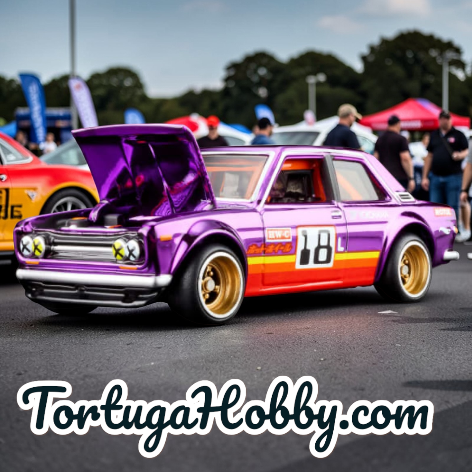 It’s dime time again with a dashing Red Line Club Exclusive ’71 Datsun 510 finished in warm, vintage-inspired Spectraflame purple. The race-ready Bluebird bears the number 18 as a quiet nod to what’s happening under the opening hood: an L18 inline-four with two side-draft carburetors. To top it off, it leans fully into its racing roots with an aggressive racing stance that seats the chassis perfectly over metallic gold Real Riders wheels with silver foil lips.