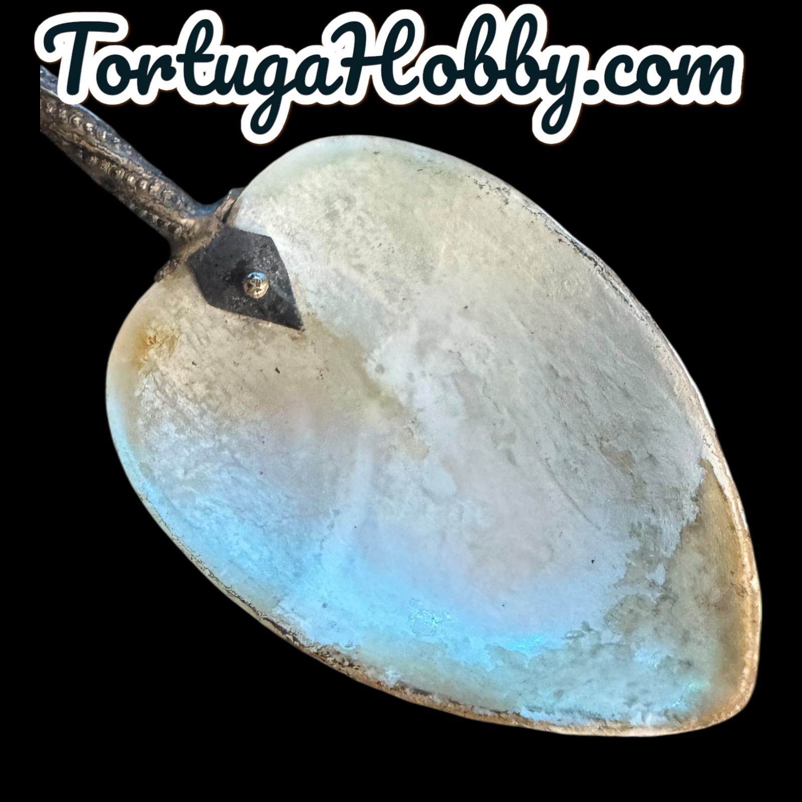 - Materials: The handle appears to be made of sterling silver or a silver alloy, while the unique, iridescent bowl is likely made from mother-of-pearl, a common material for decorative and antique flatware.