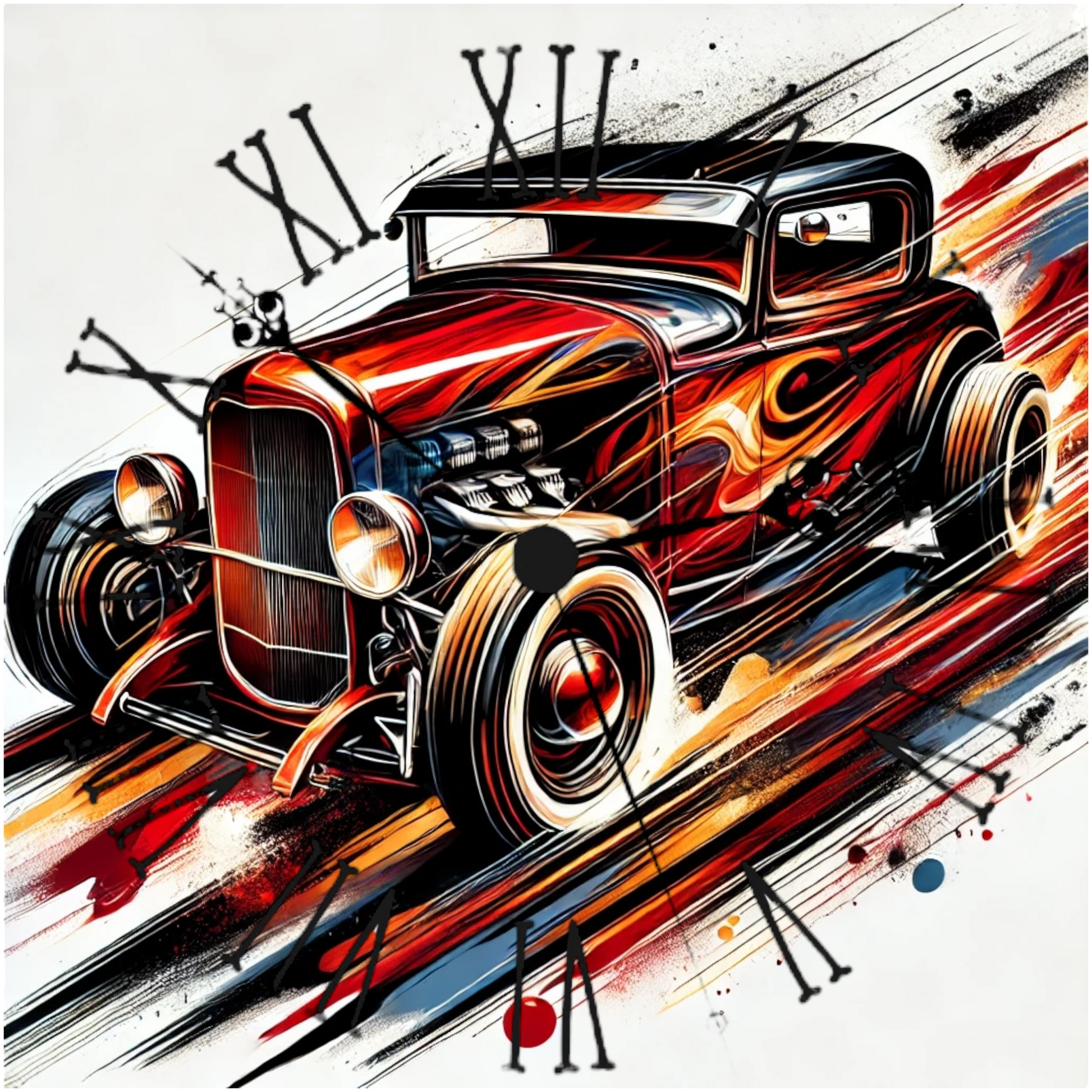 • Unique Design: Each clock face features an abstract representation of a hot rod, combining fiery reds, metallic silvers, and deep blacks. The energetic, sweeping brush strokes and dynamic color splashes convey the powerful aesthetics and sleek lines of these timeless machines.
