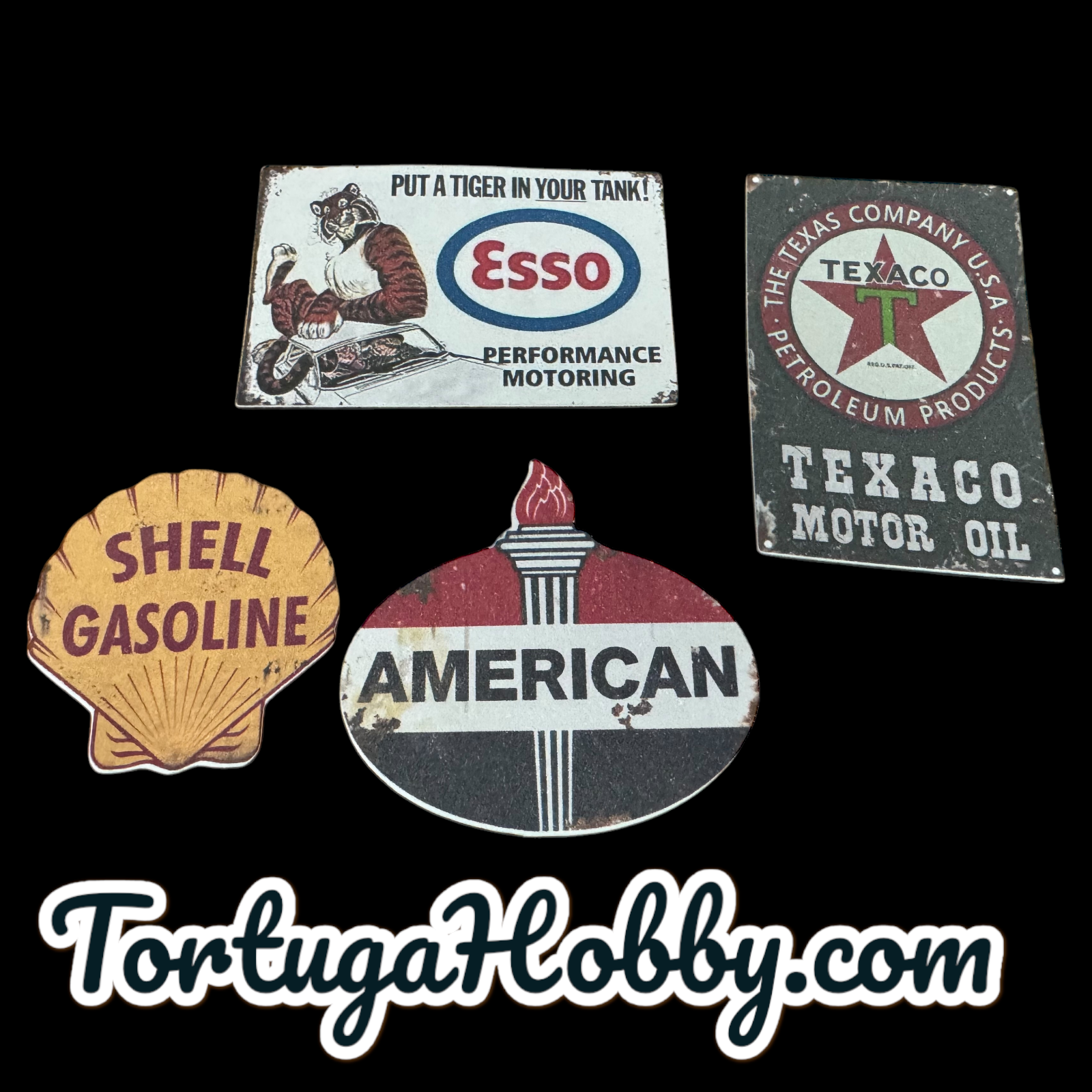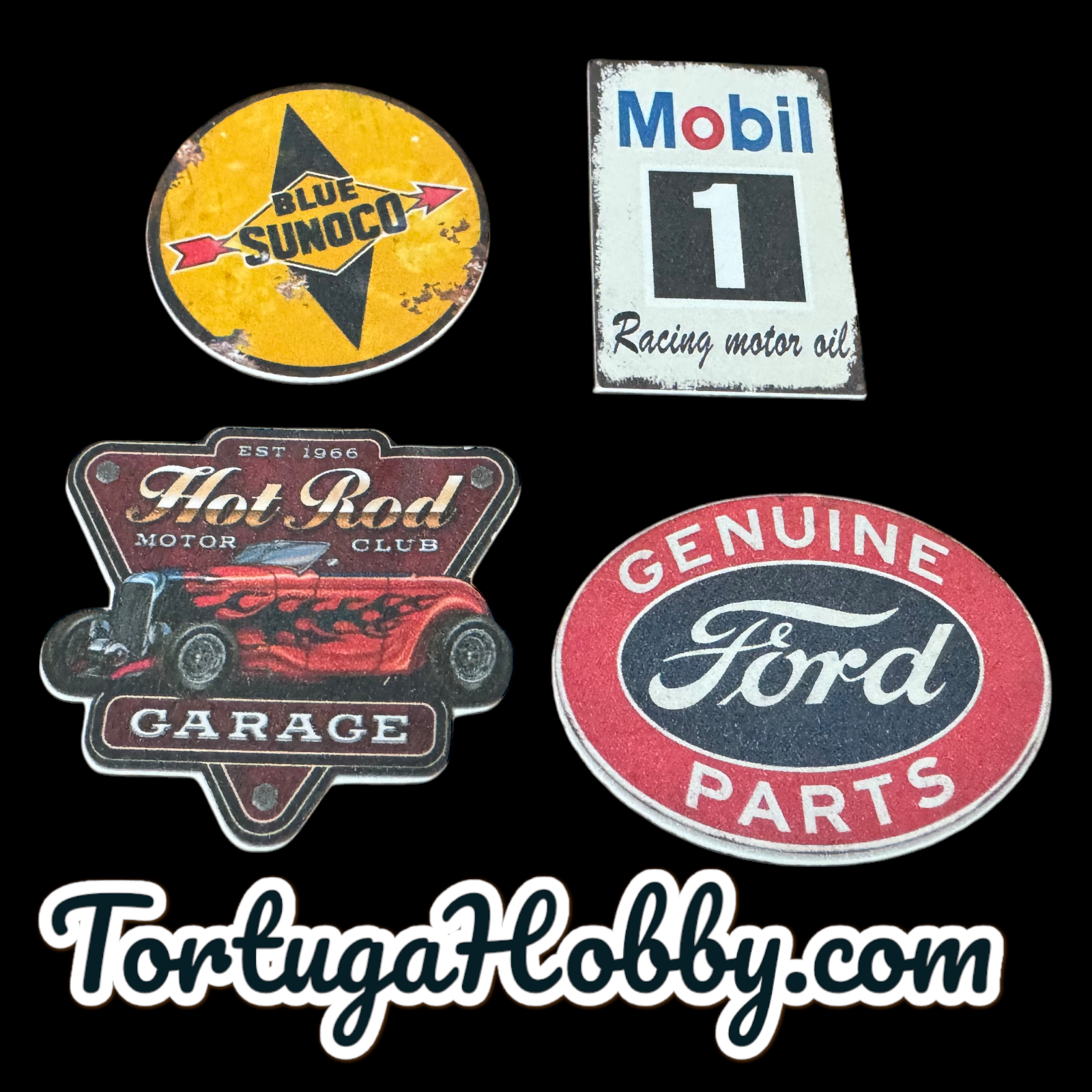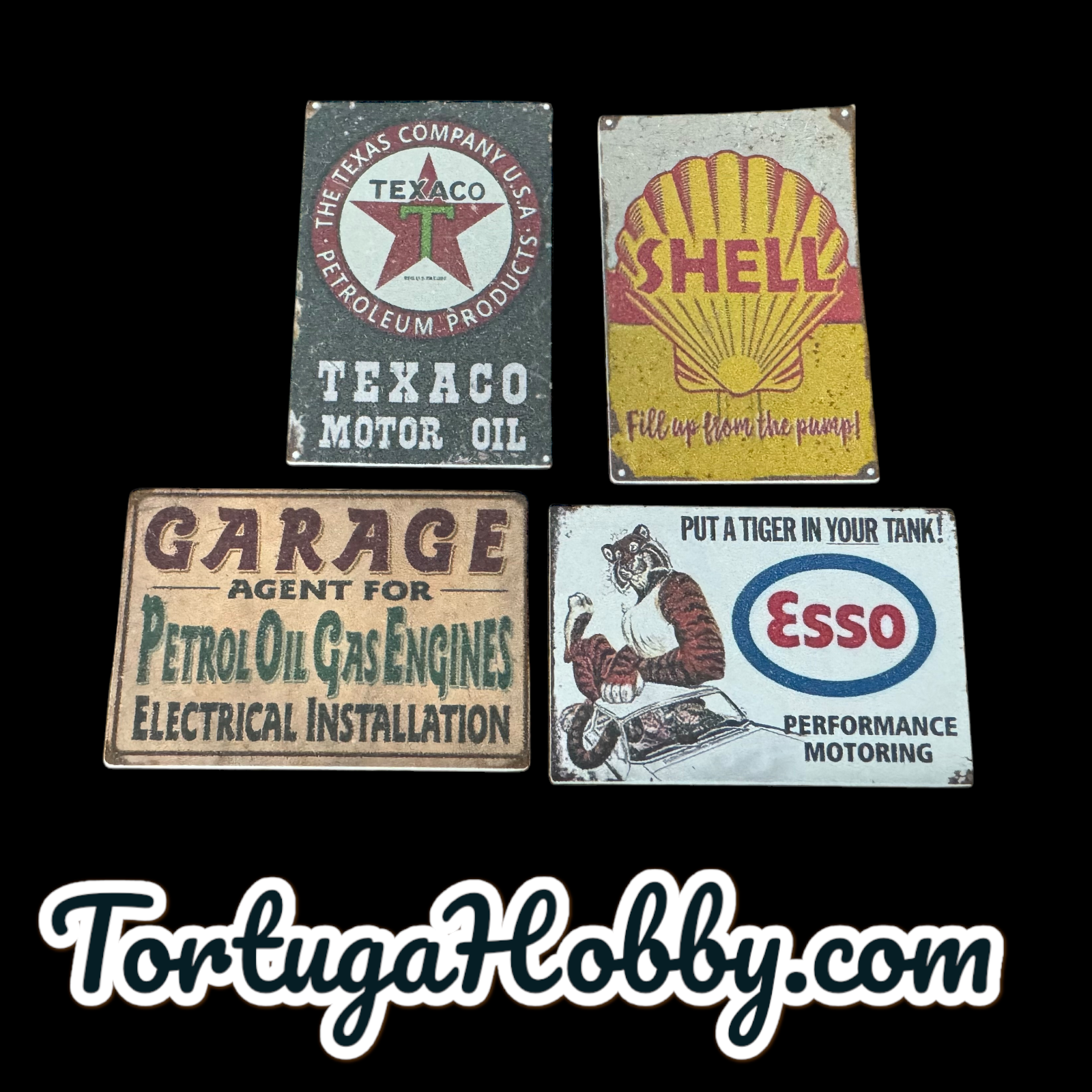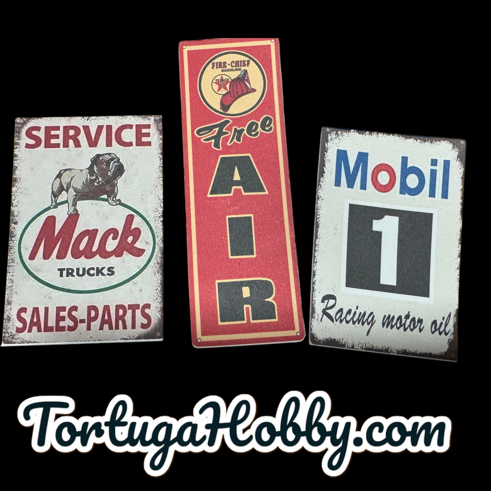 Perfect for model car displays, scale garages, train layouts, and dioramas, these signs feature detailed designs, vibrant colors, and a weathered vintage aesthetic that make them look like they’ve been hanging in a real shop for decades. Whether you’re recreating a historic service station or adding realism to your hobby setup, our signs are the perfect finishing touch!