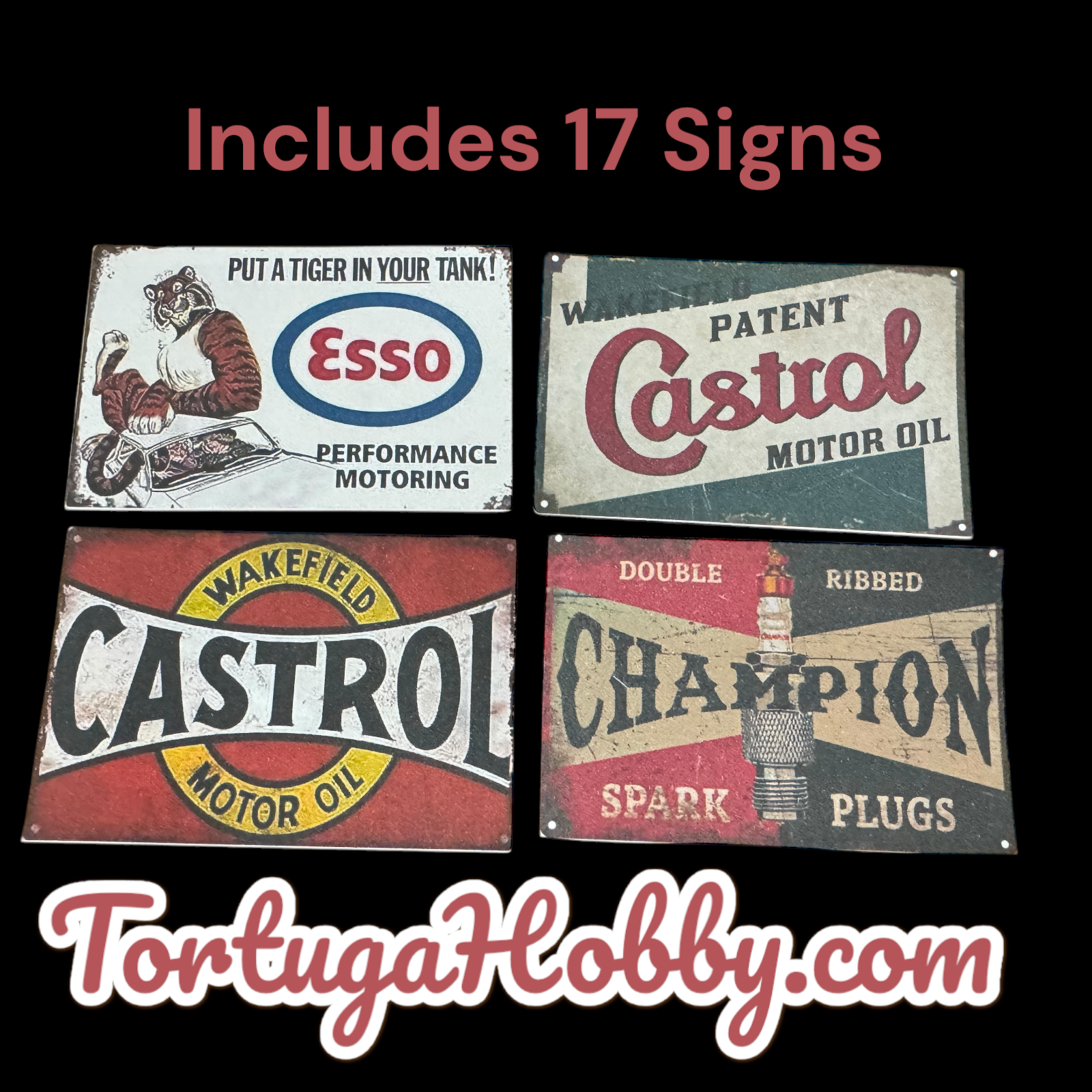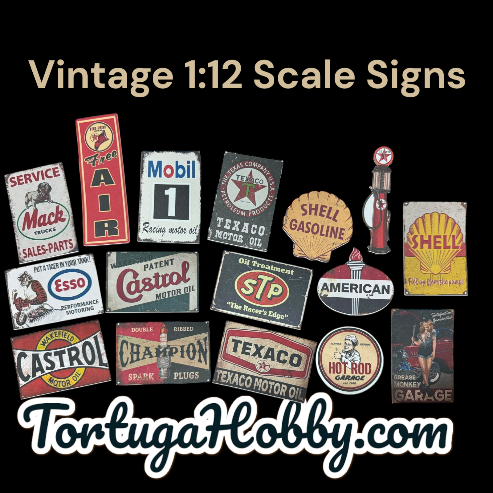 Browse our collection and give your project that classic garage feel! Includes around 17 signs and is available in 1:12, 1:18, 1:24 or 1:64 Scale.