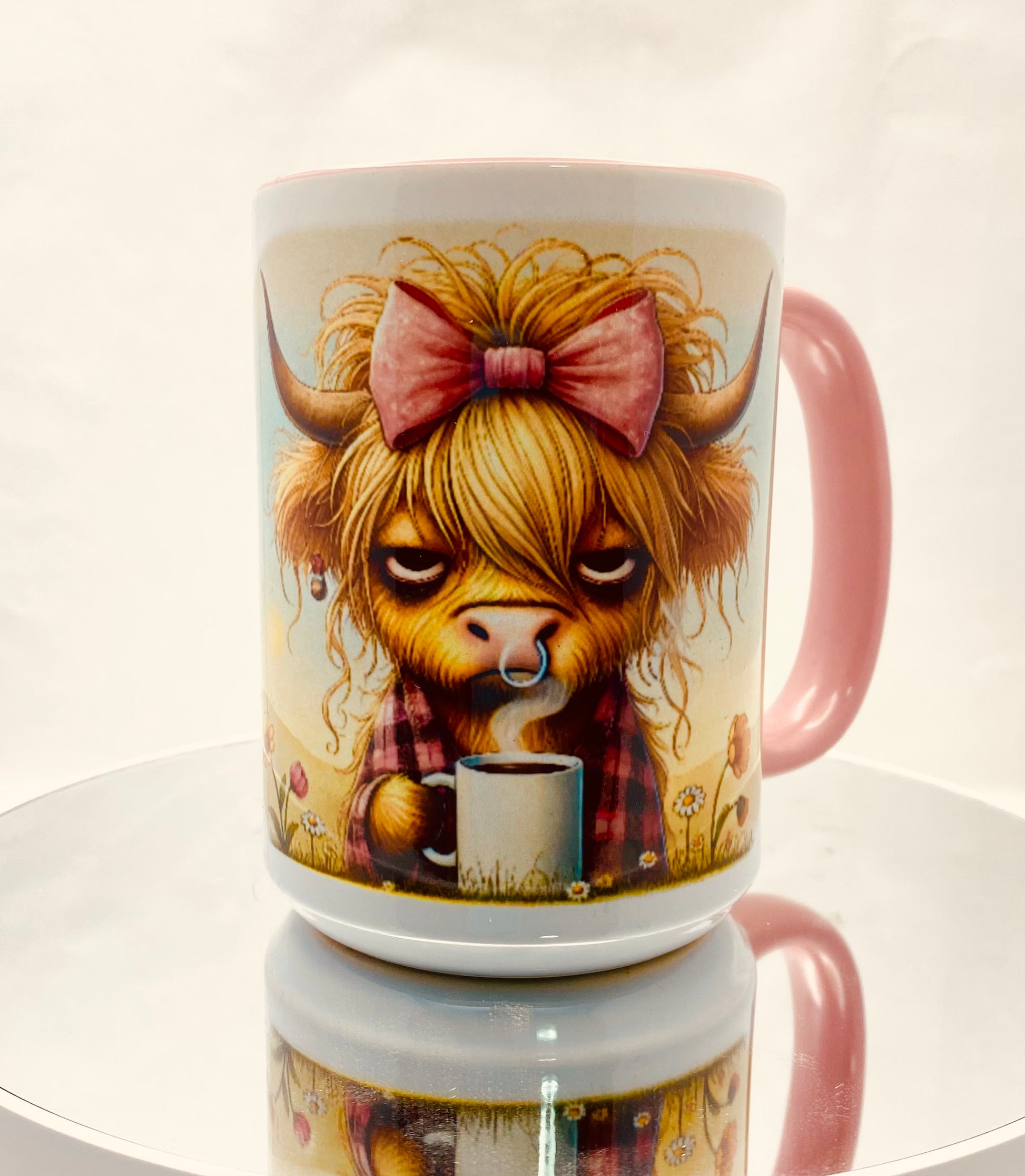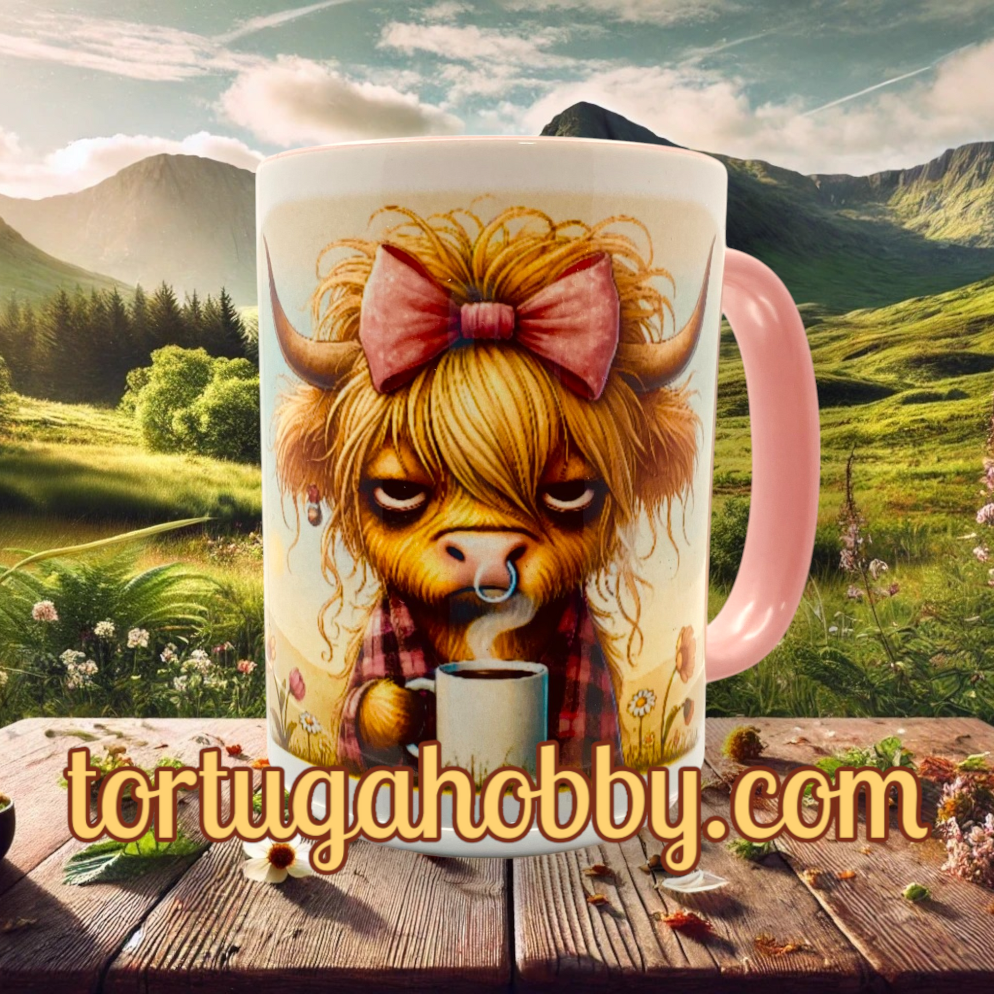 Start your mornings with a touch of Highland charm with our Grumpy Cow mug. This adorable mug features a whimsical illustration of a grumpy Highland cow sipping a steaming cup of coffee. Clearly this girl had a hard night and just wants to be left alone until her caffeine kicks in!
