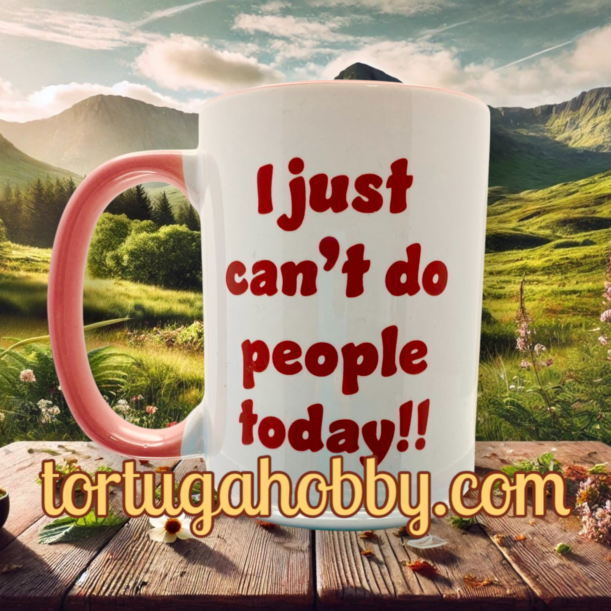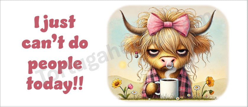 Design: A delightful Highland cow with a cozy plaid scarf in a peaceful countryside setting and the text “I just can’t do people today!!”