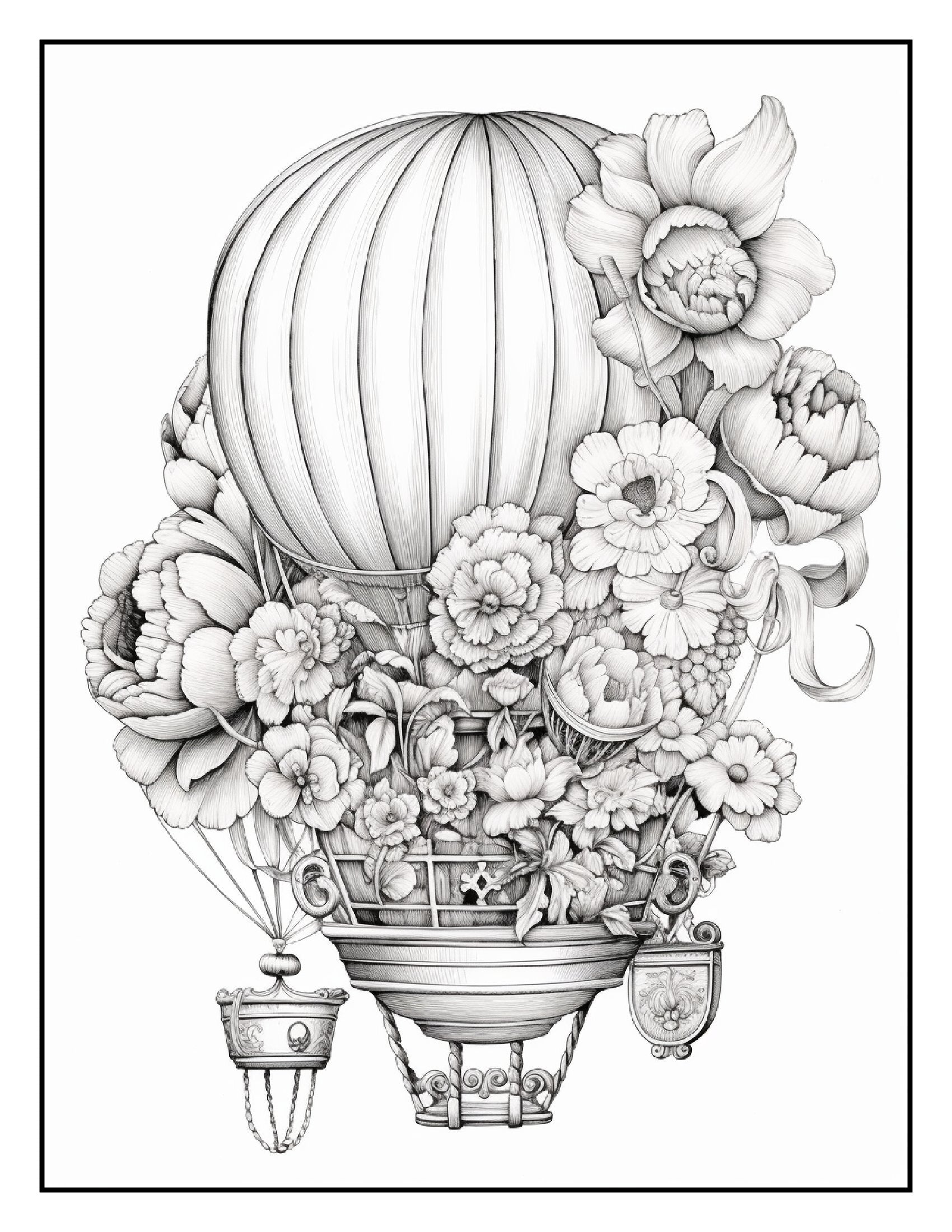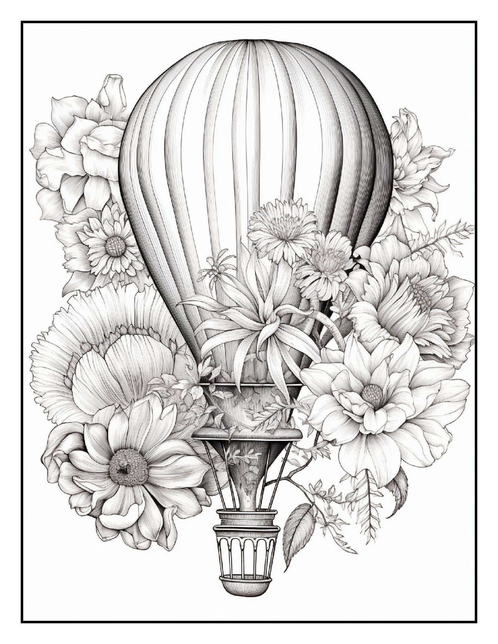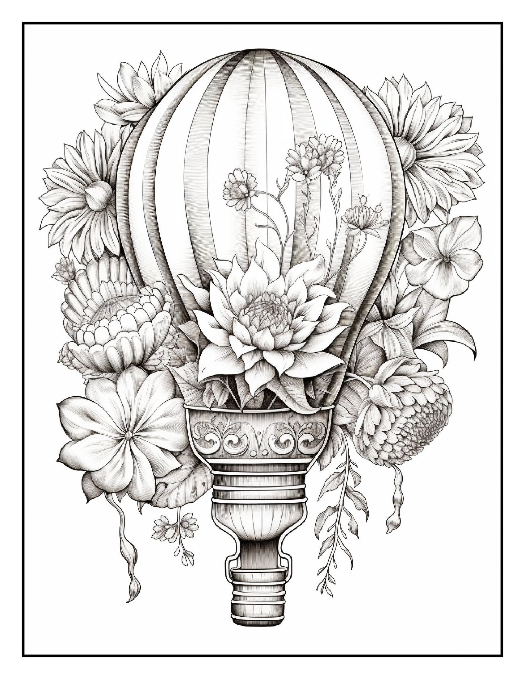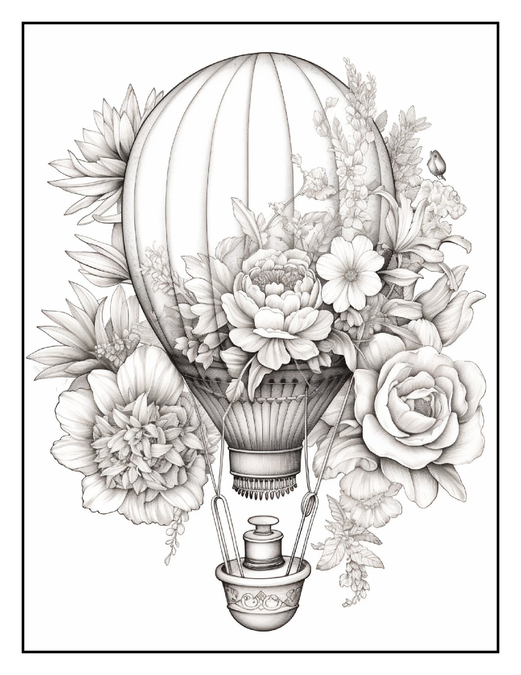 Inside this captivating book, you'll find over 100+ pages of intricate illustrations featuring hot air balloons wrapped in vibrant flower bouquets. Each page is a celebration of creativity, showcasing detailed designs that blend the graceful ascent of balloons with the lush, delicate charm of various flowers. From tulips and roses to sunflowers and daisies, these hot air balloons are adorned with a breathtaking array of blossoms, making each page a canvas for your artistic expression.