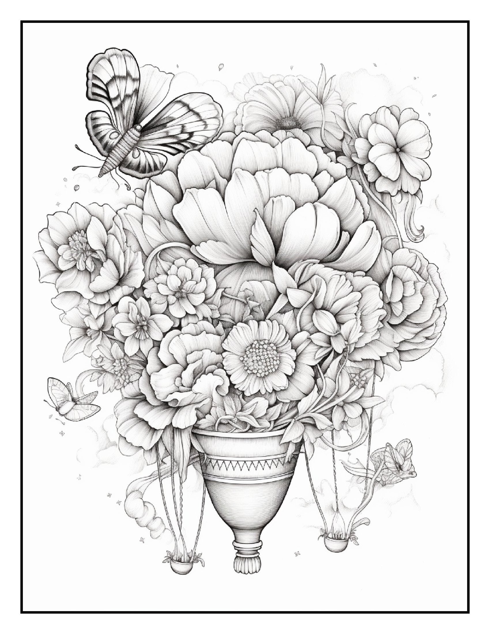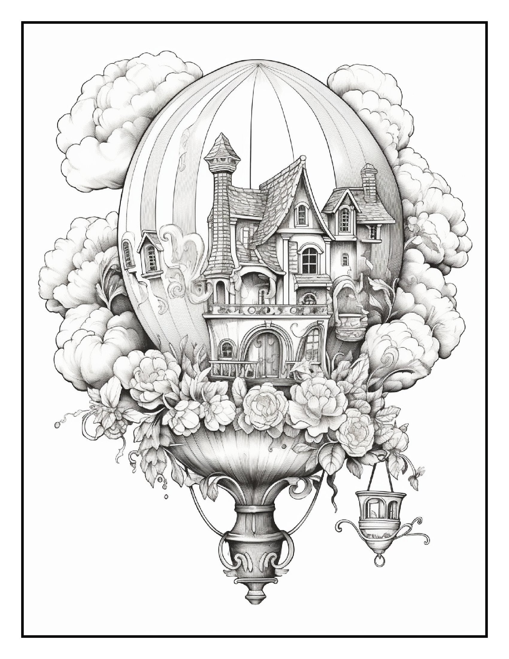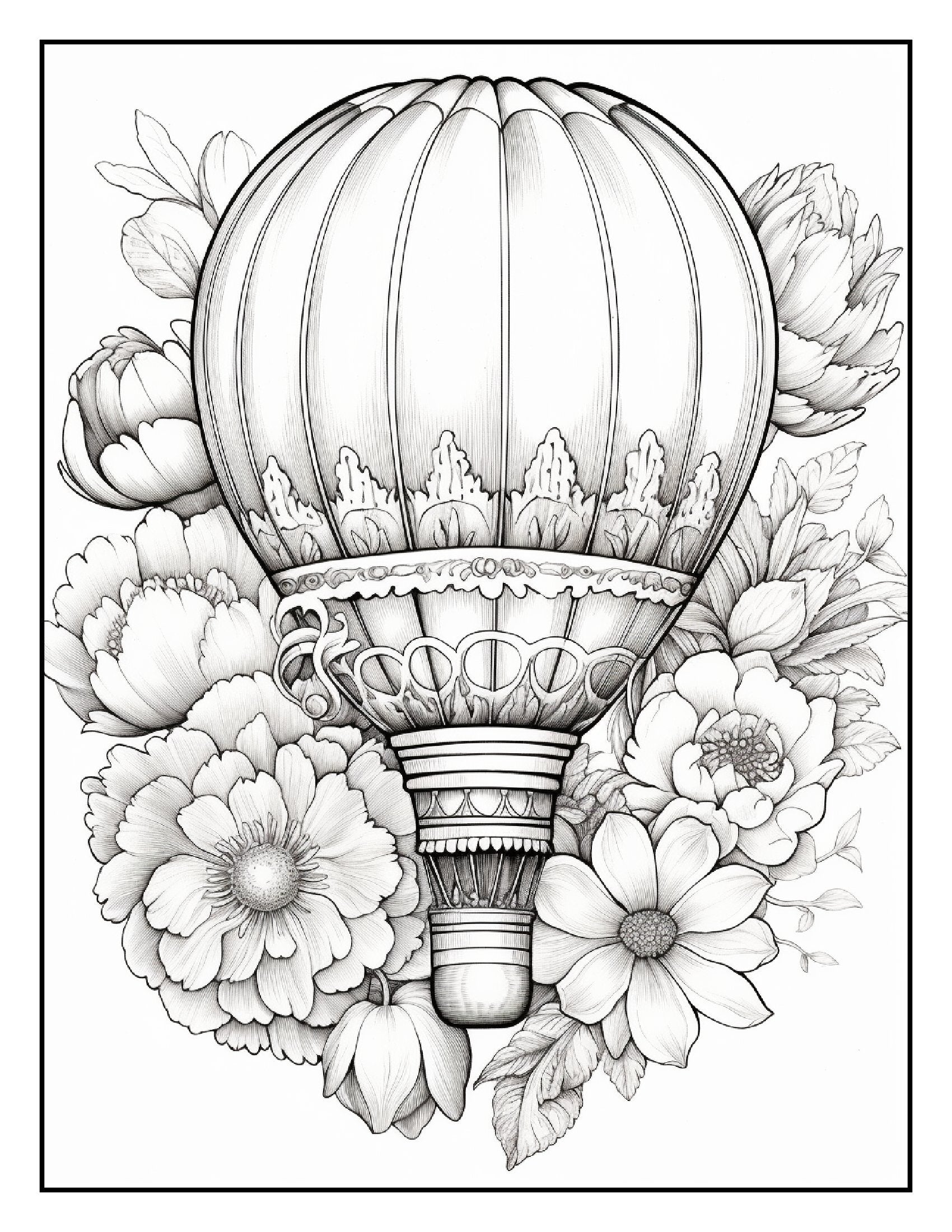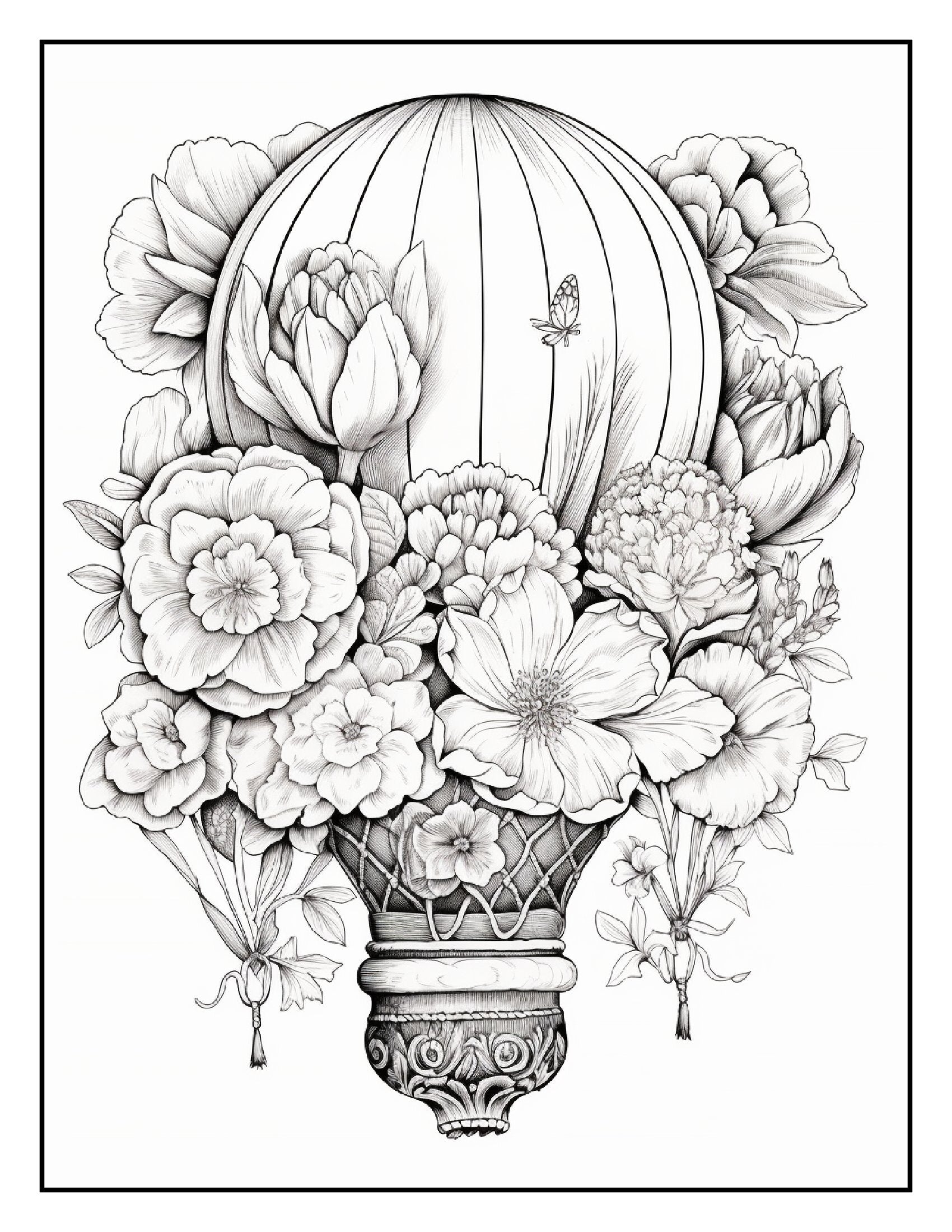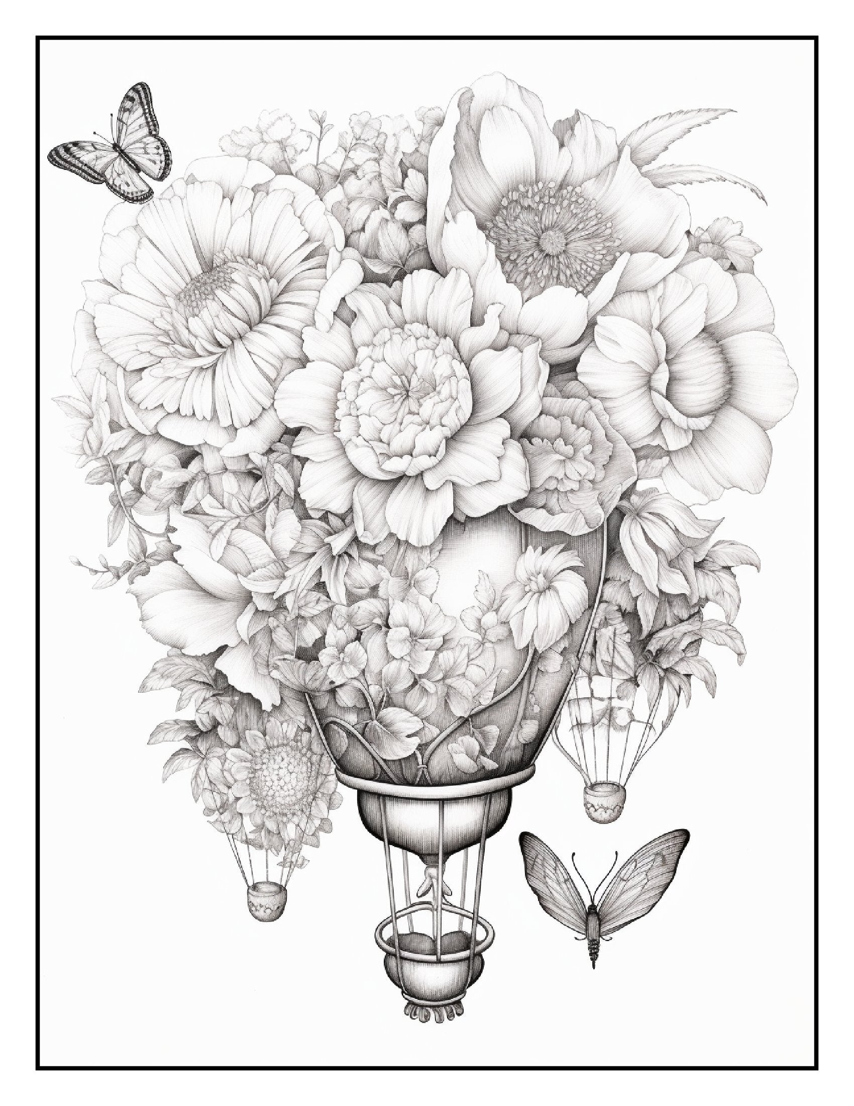 Inside this captivating book, you'll find over 100+ pages of intricate illustrations featuring hot air balloons wrapped in vibrant flower bouquets. Each page is a celebration of creativity, showcasing detailed designs that blend the graceful ascent of balloons with the lush, delicate charm of various flowers. From tulips and roses to sunflowers and daisies, these hot air balloons are adorned with a breathtaking array of blossoms, making each page a canvas for your artistic expression.