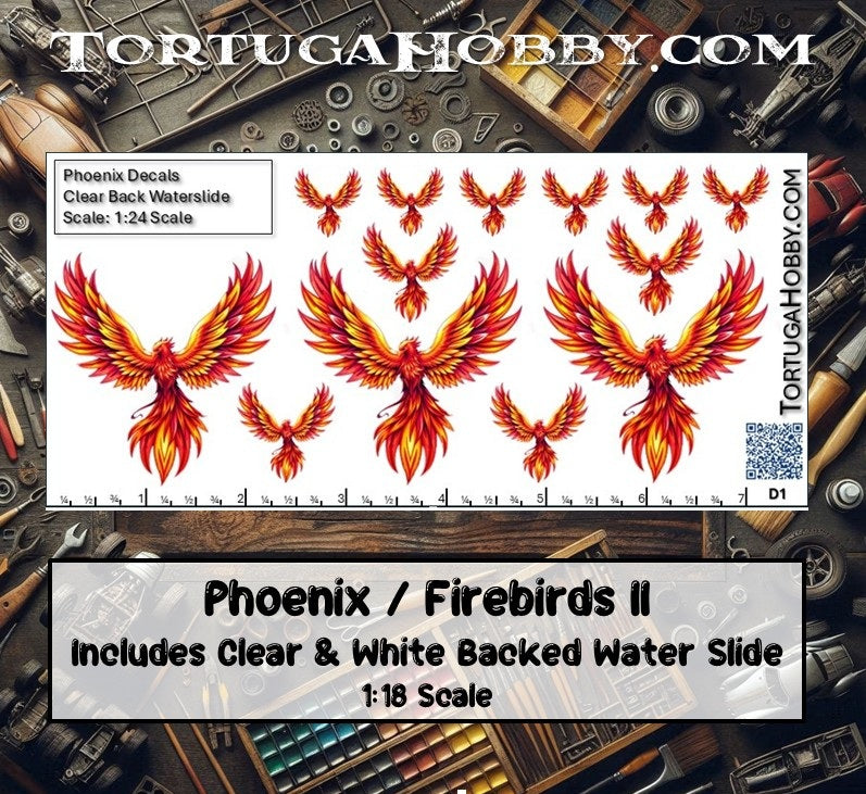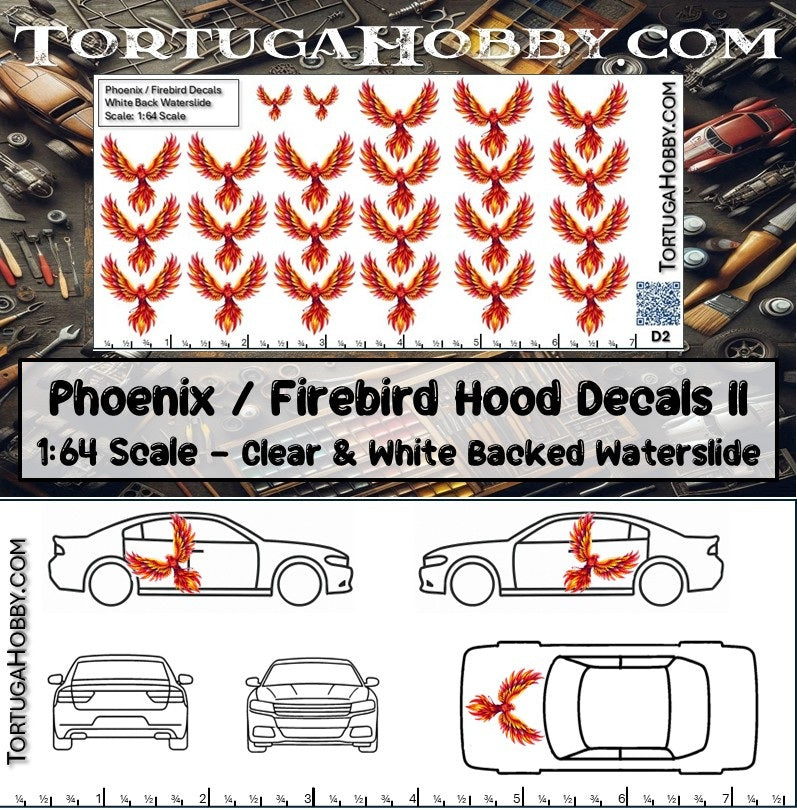 Transform your models into eye-catching masterpieces with our Phoenix/Firebird decal! Upgrade your bird today! Includes 2 sheets, 1 clear back and 1 white back waterslide.