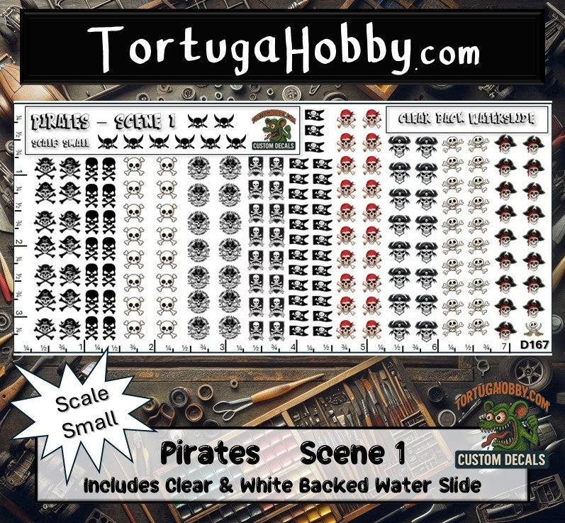 Ahoy, mateys! Set sail on a swashbuckling adventure with our Pirates in Scene I, Water-Slide Decals, the ultimate treasure for hobbyists and crafters looking to add a touch of the high seas to their creations. This edition is packed with designs that capture the spirit of pirate lore, from Jolly Rogers to treasure chests and fearsome pirate ships.