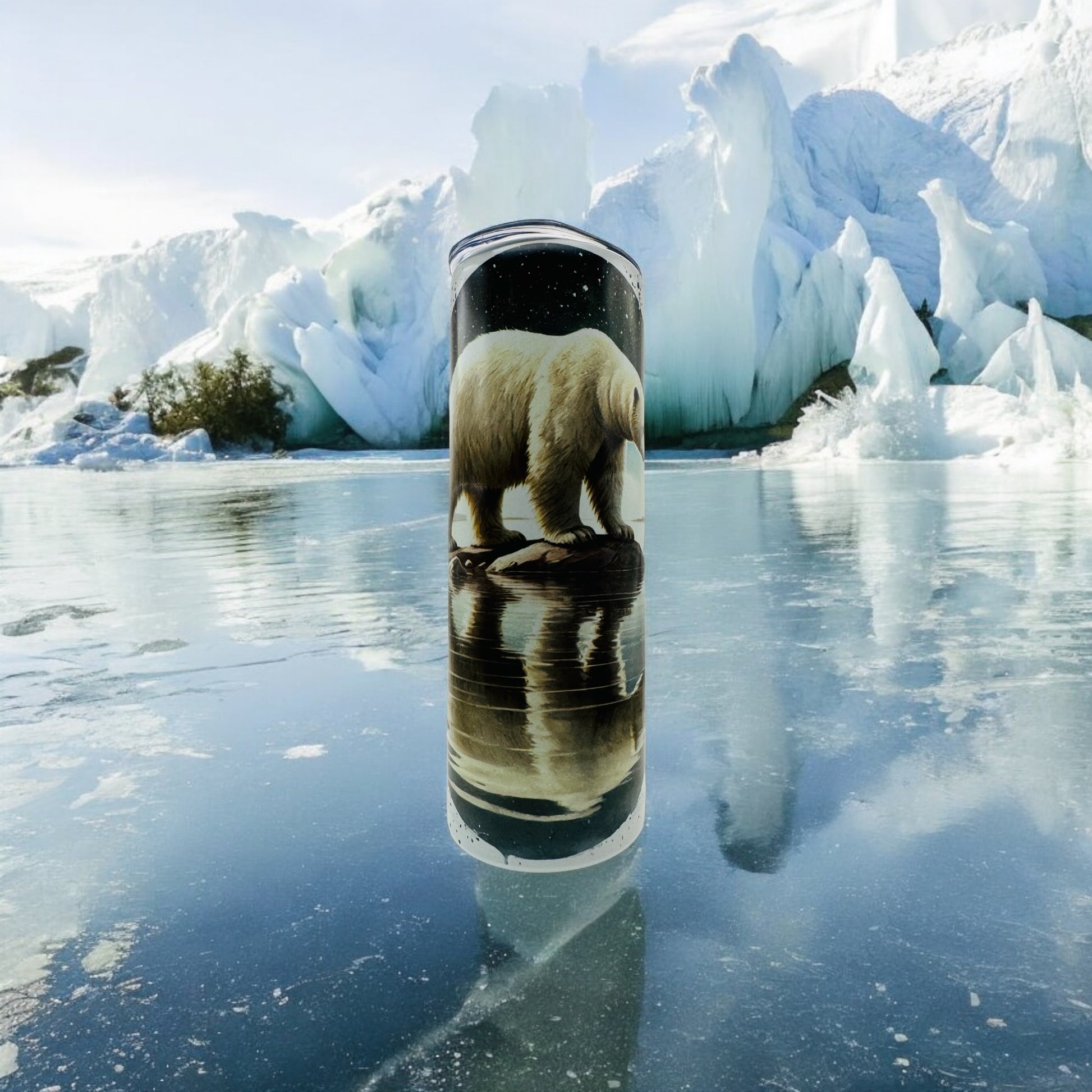 Elevate your beverage experience with our stunning 20 oz stainless steel tumbler, featuring a majestic polar bear gazing at his own reflection in the ice. This beautifully designed tumbler is not just a drinkware item; it’s a piece of art that captures the serene beauty of the Arctic wilderness.