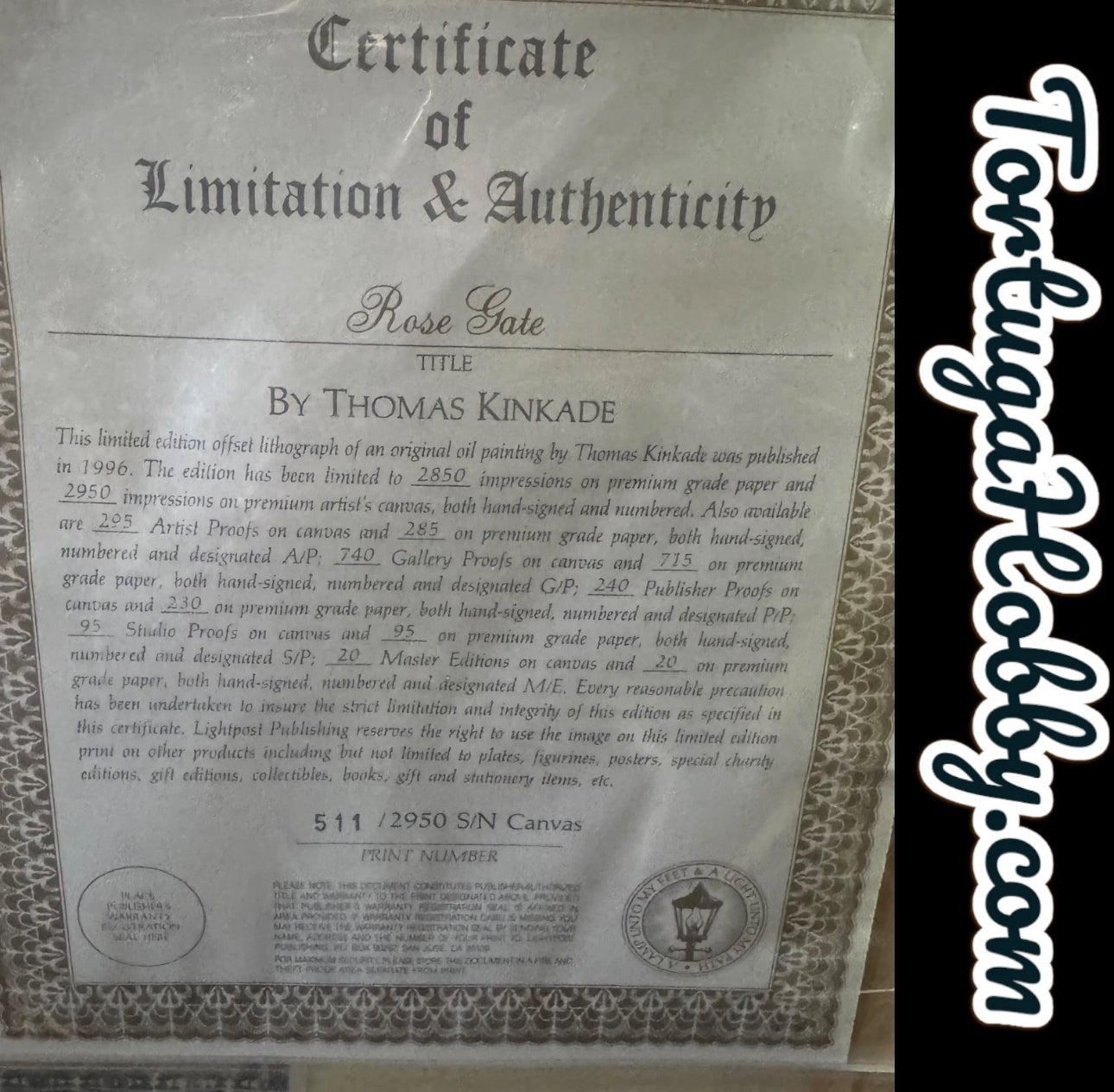 Limited Edition Offset Lithograph published in 1996. Limited to 2850 on Paper and 2950 on canvas, all hand signed by Thomas Kinkade. This one is Canvas, 511 of 2950 with supporting paperwork and they match the hand written signature on canvas.