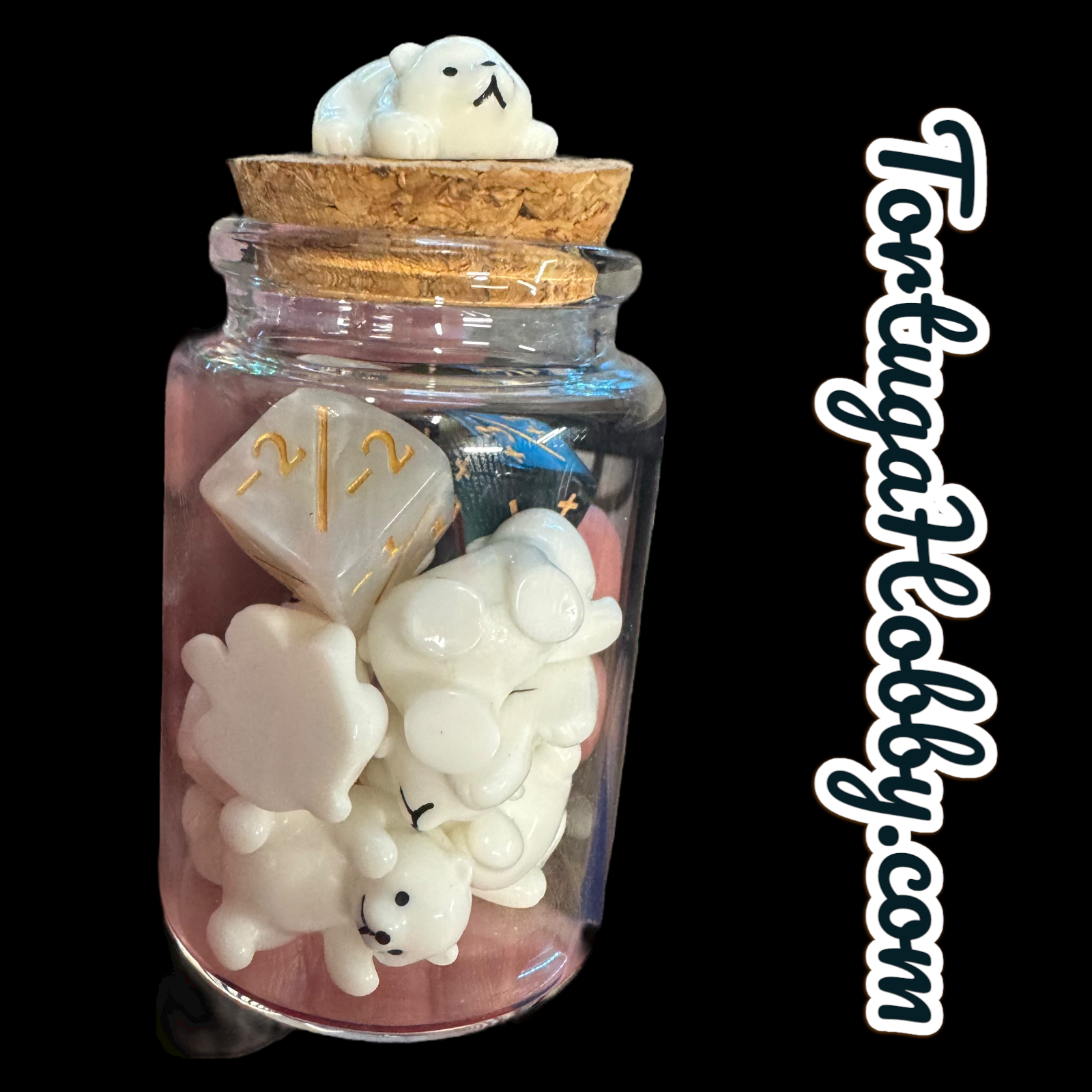 Unleash the magic at your next game night with our polar bear Counters. This set includes finely detailed counters featuring unique designs, each stored in a durable, clear glass vial with a secure cork stopper. Perfect for collectible card games, tabletop role-playing, board games, or as a unique display piece for fantasy lovers.
